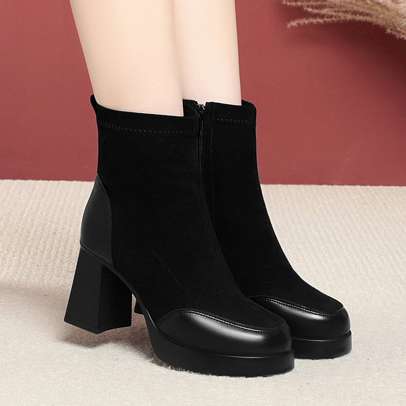 春と秋の靴のスエードの弾力性の痩せた靴の方頭のハイヒールのショートブーツの女性の太さとチェルシーのブーツの便利な側のファスナー