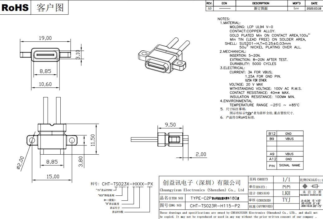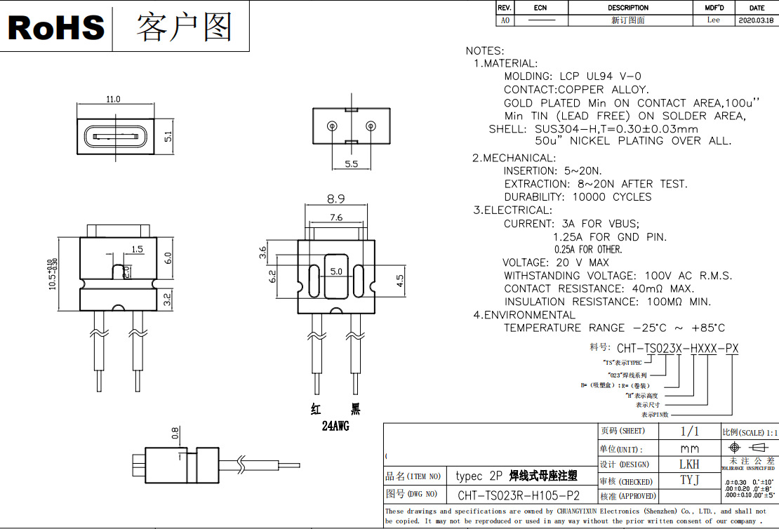 TYPE-C母座溶接線USB C携帯電話充電口TPC防水typec2 p直圧テールプラグ電源座