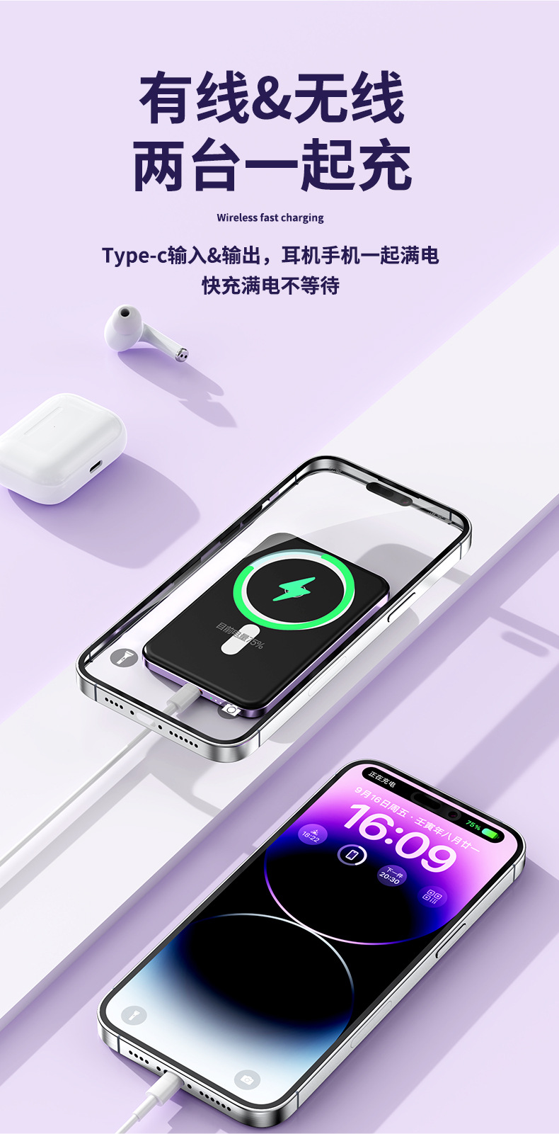 源头工厂15W磁吸无线充电宝10000毫安快充超薄铝合金移动电源外贸