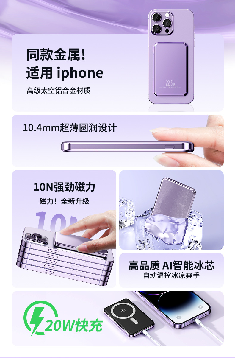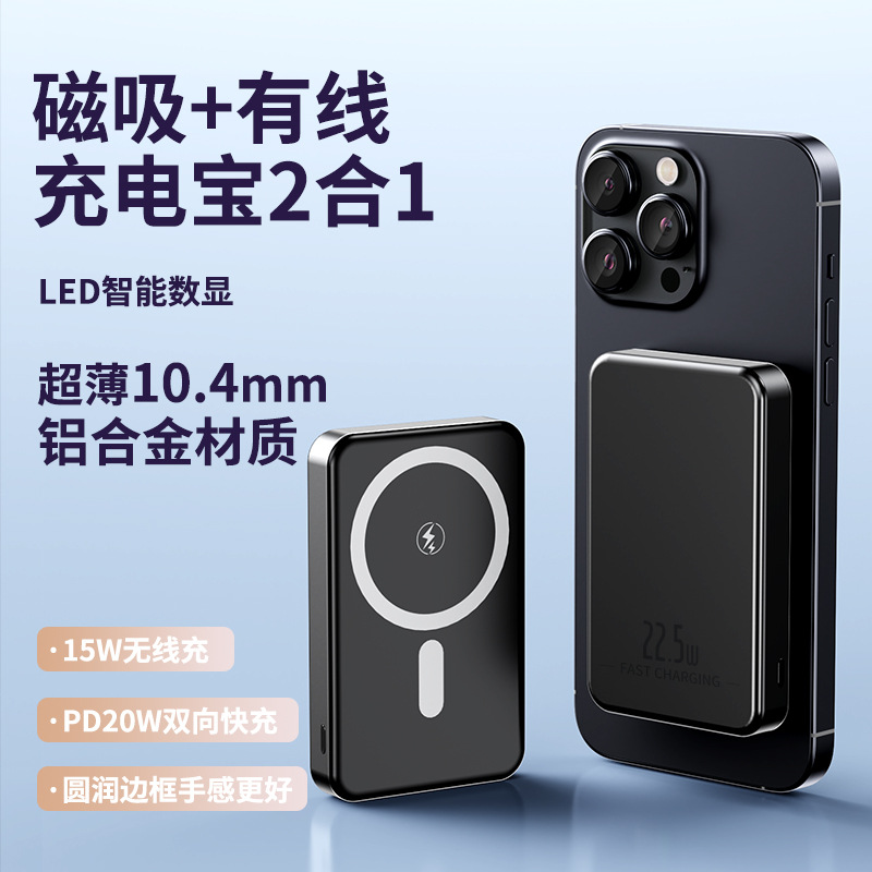 新型超薄型アルミニウム合金マグネット15w無線充電宝10000ミリアンペア20w双方向充電モバイル電源