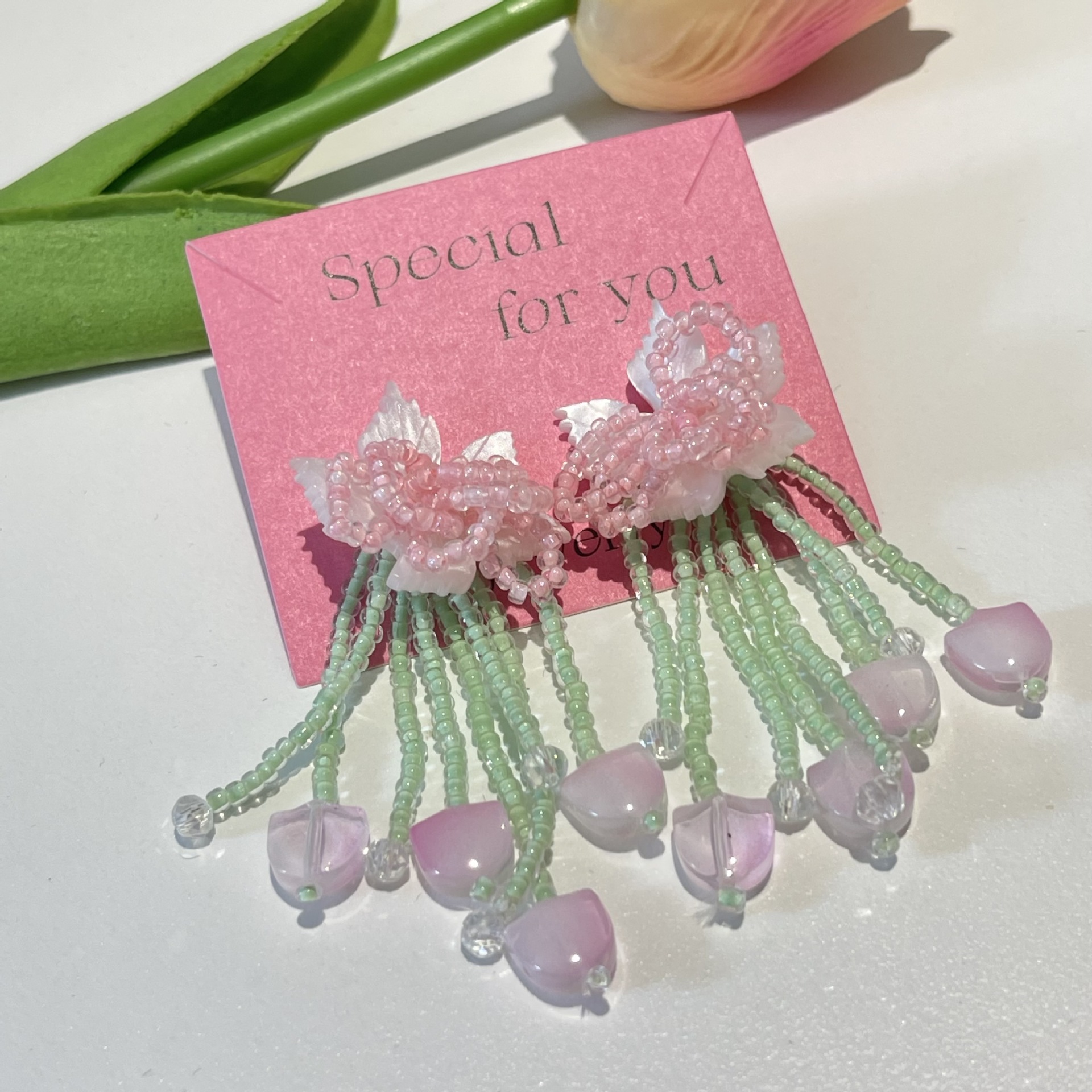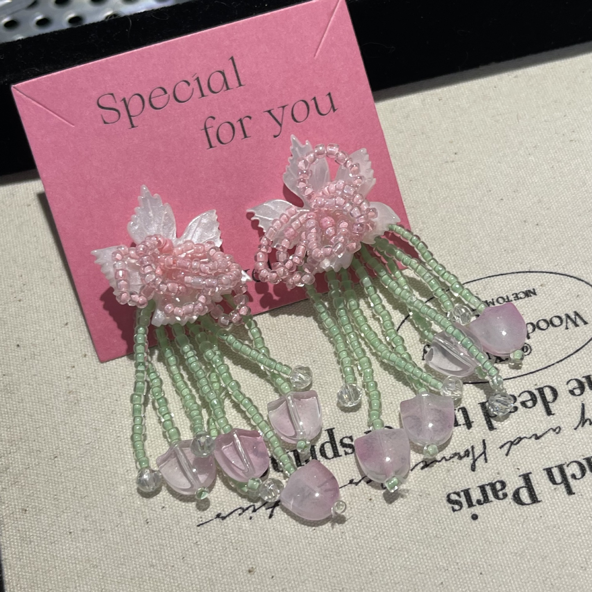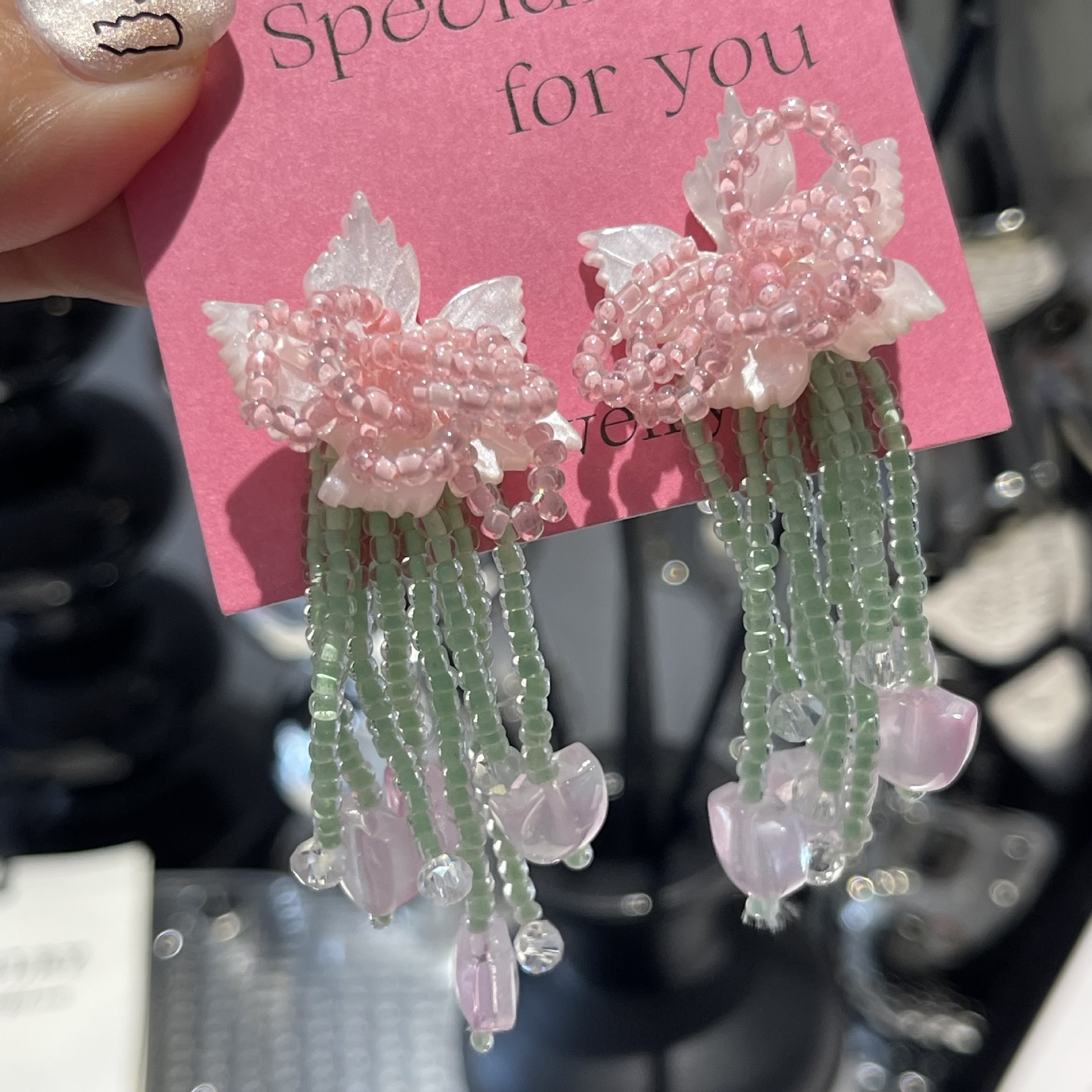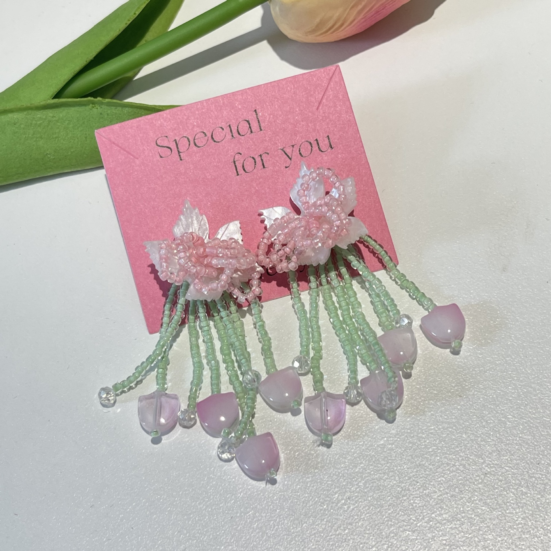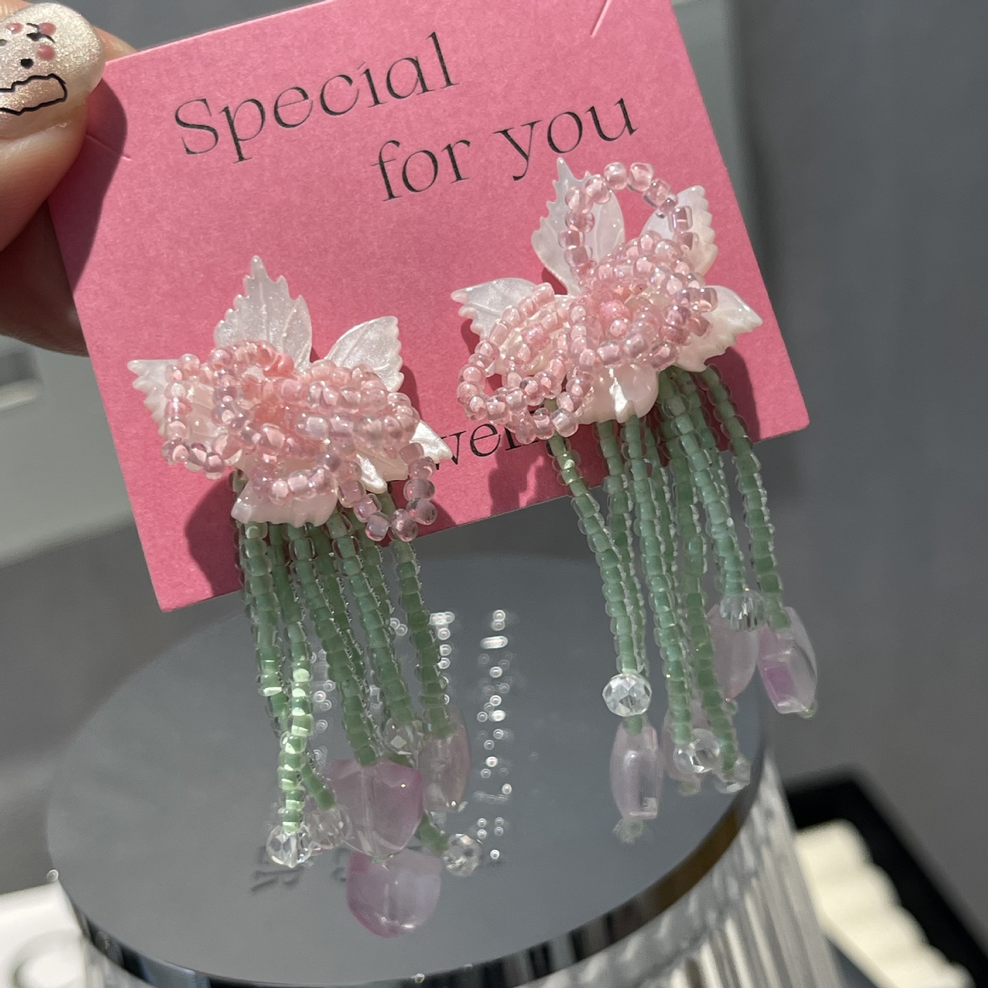 リゾート風カラービーズ貝殻花流蘇イヤリング夏の甘いかわいいドーパミン花びらイヤリング女性銀針