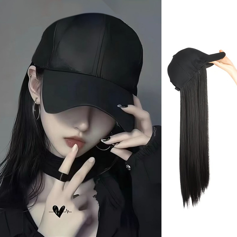 帽子とウィッグが一体化した女性のロングヘア、ベージュブラックのひさしキャップ、ロングストレートヘア、ヨーロッパとアメリカのファッション、多用途の新しい帽子とヘア