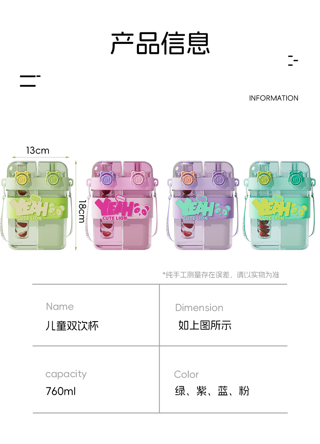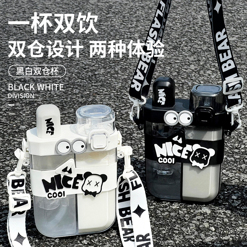 卡通分仓双饮水杯创意可背带吸管杯子学生水杯儿童吸管塑料杯批发