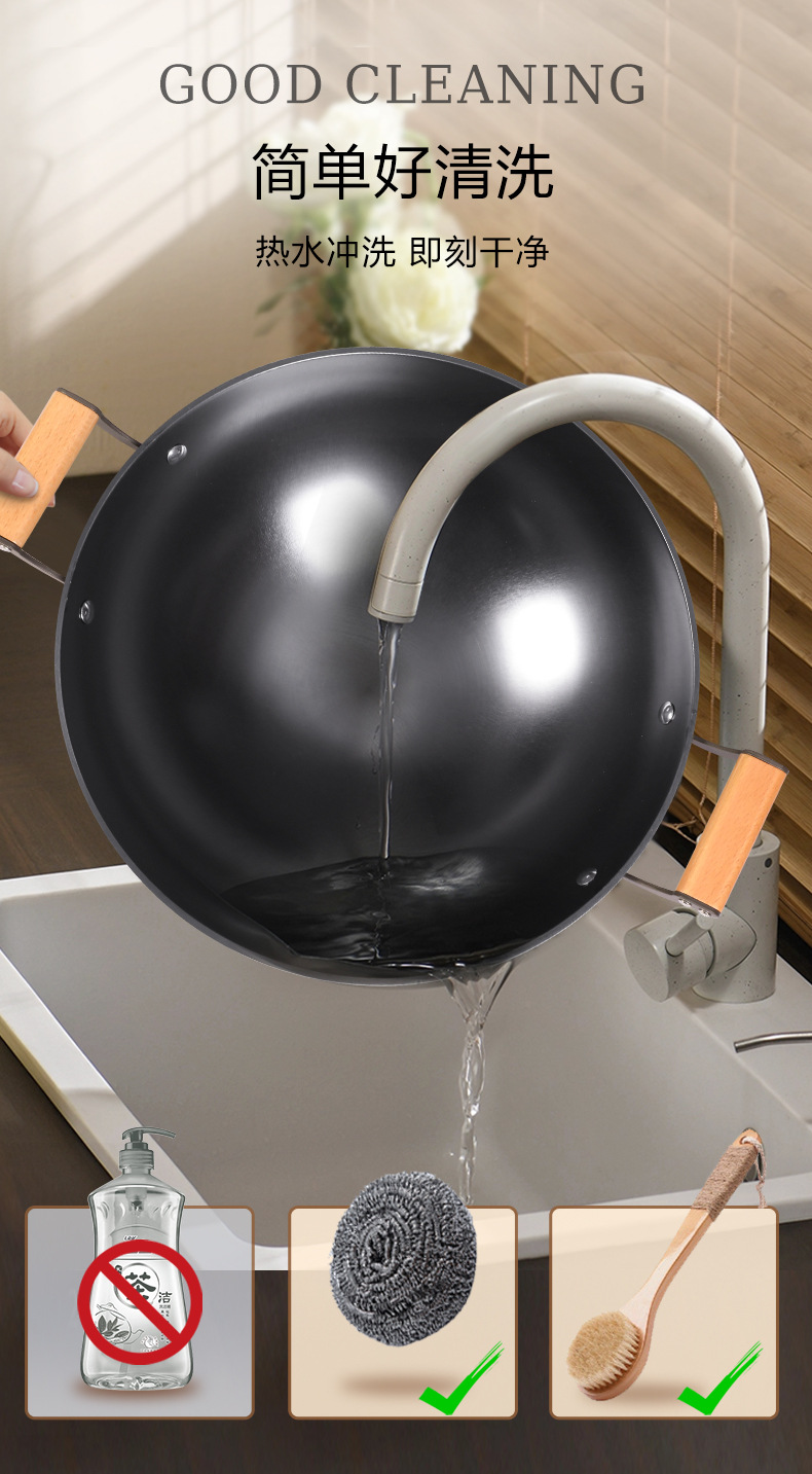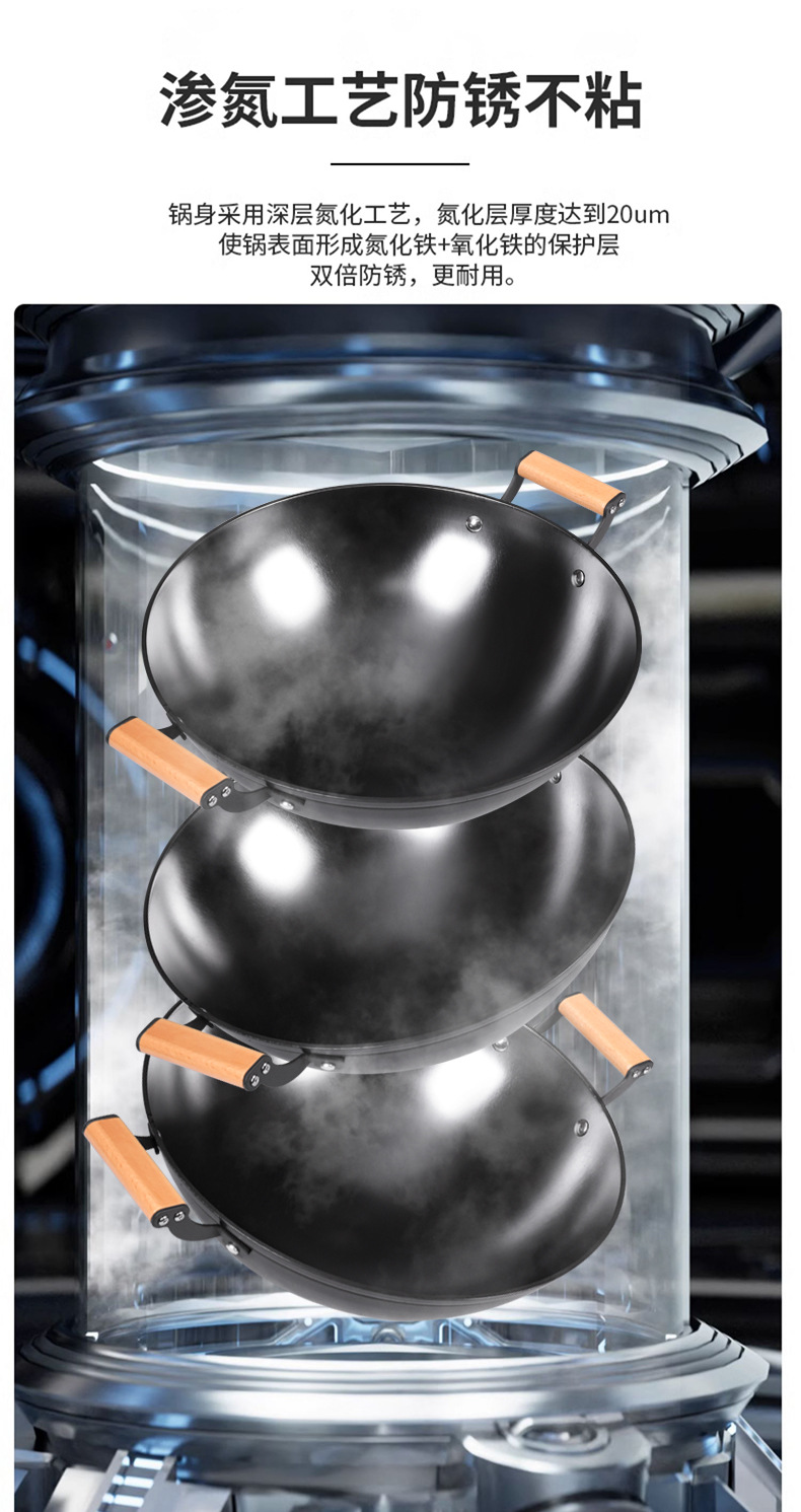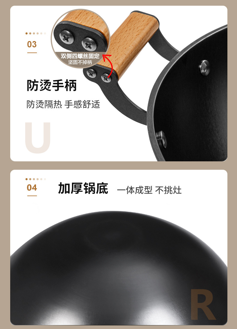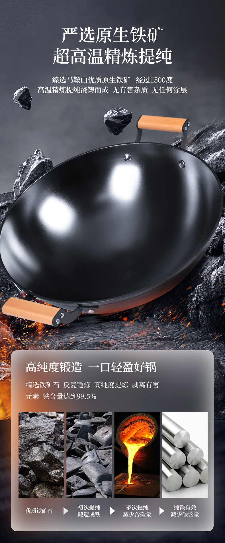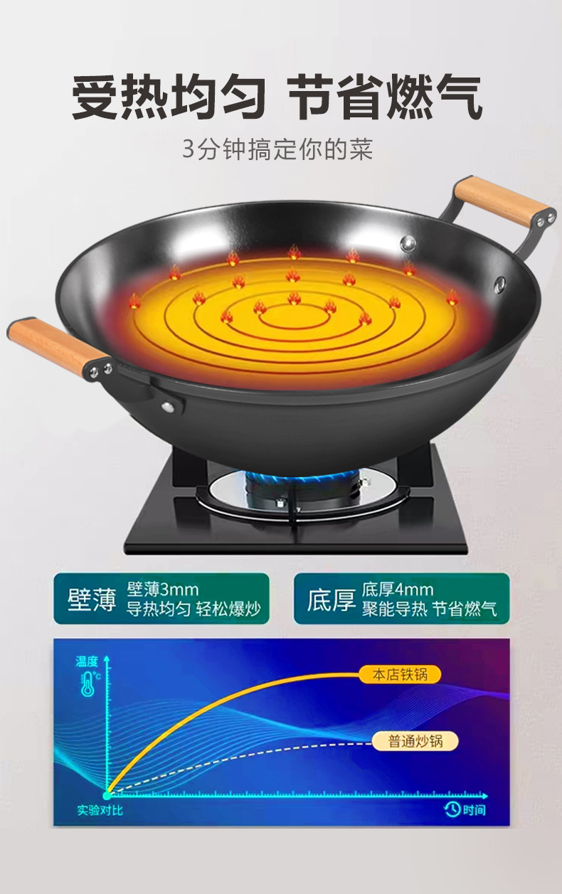 昔ながらの双耳鉄鍋、家庭用ノンコーティングノンスティック鍋、業務用丸底中華鍋、ガスコンロ専用鍋
