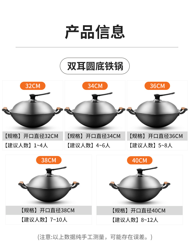 双耳鉄鍋炒め鍋家庭用炒め鍋コーティングなしの古いサイズの丸い底は鍋ガスコンロ専用です。
