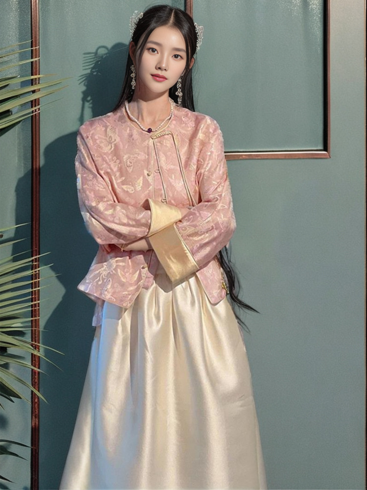 初秋の新作、新中式婦人服、中国風禅意茶服セット、ピンクの盤扣付きトップスとスカートのツーピースセット(女性用)