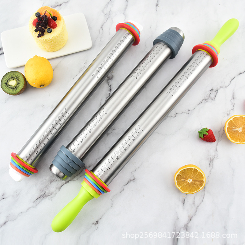家用不锈钢擀面杖带硅胶圈可调节厚度面粉棍可变厚度一体滚轮滚筒