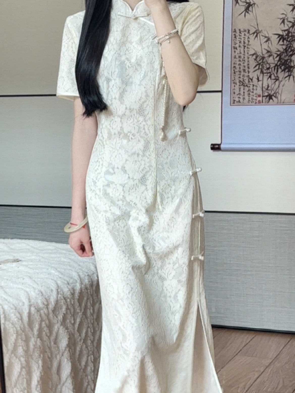 新しい中国式のチャイナドレスの透かし彫りの低い胸の半袖のワンピースの女性の夏の純粋な欲のセクシーな腰の包みのお尻のオープンフォークの長いスカート