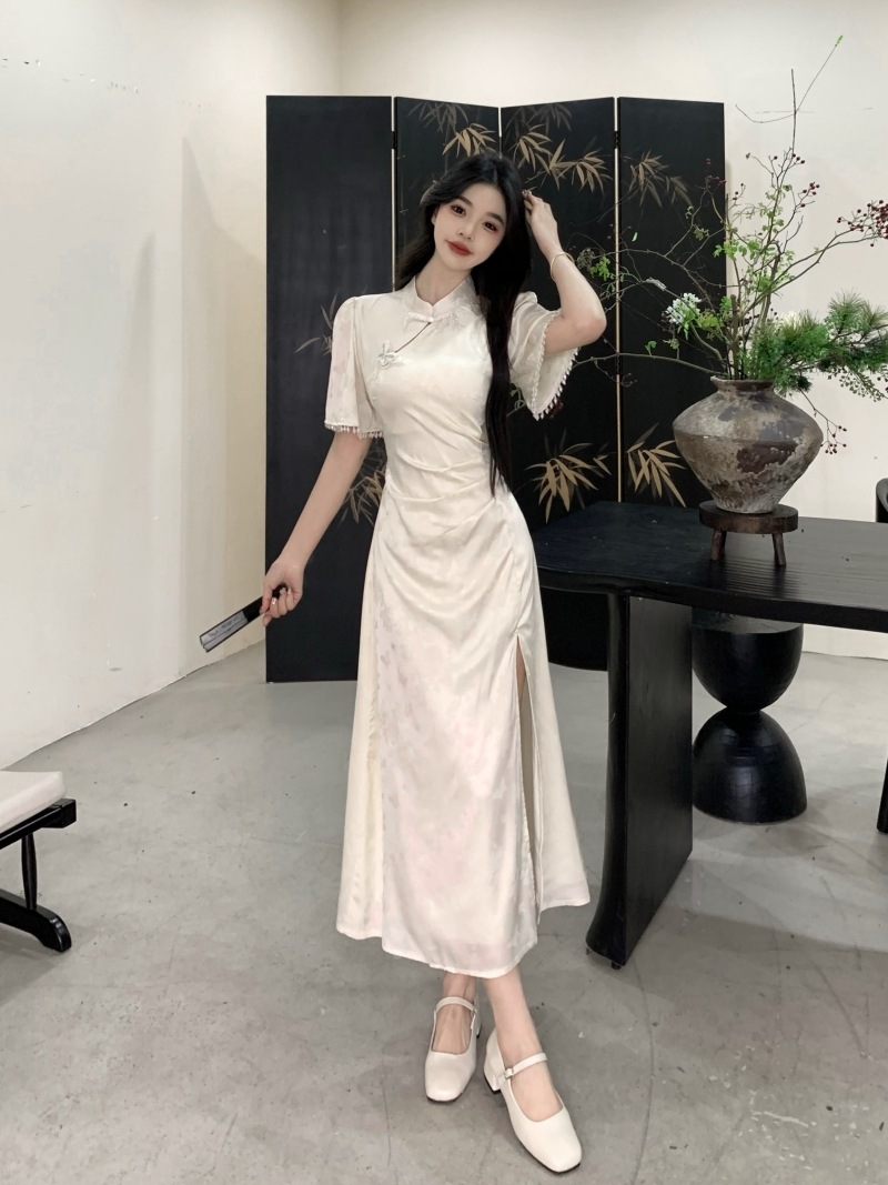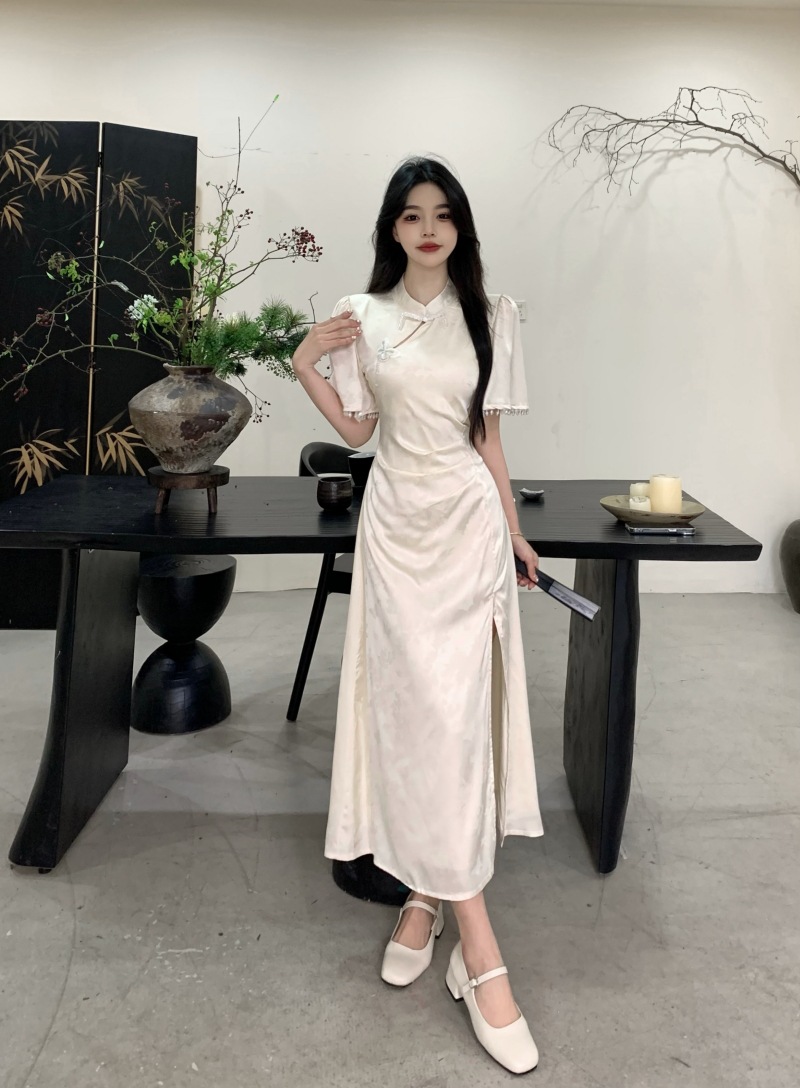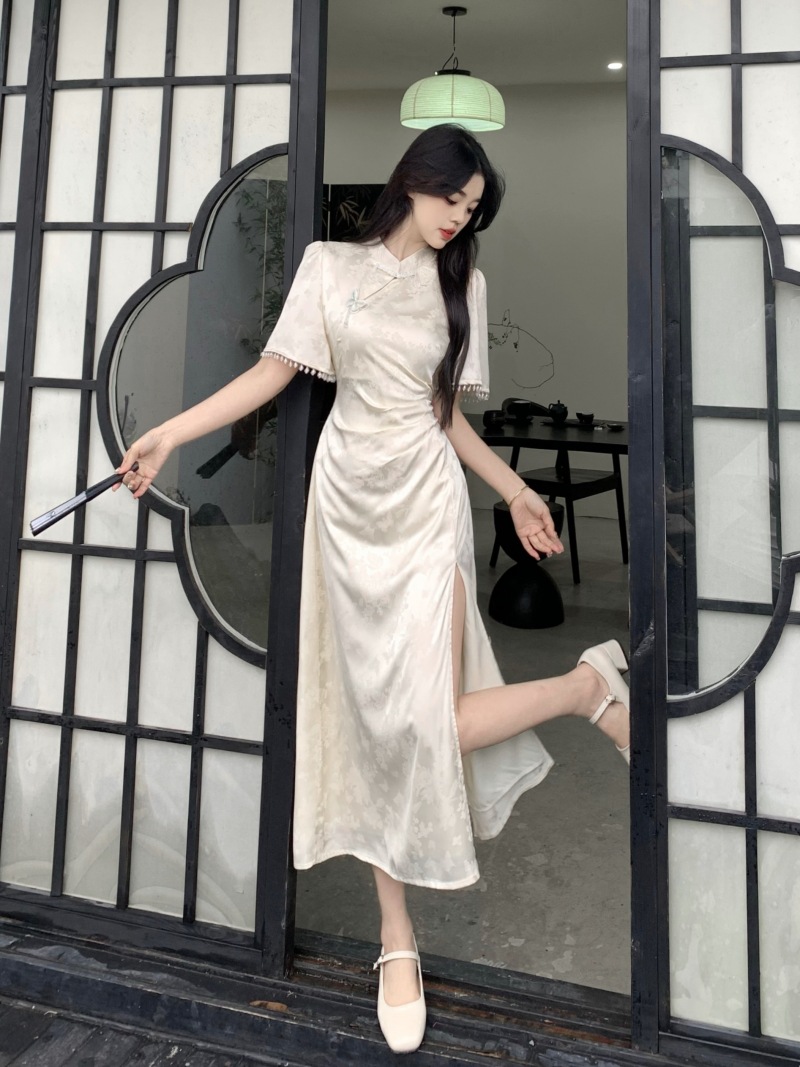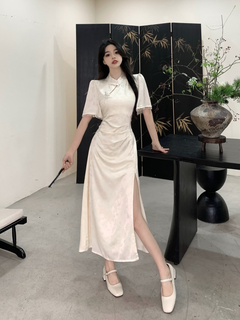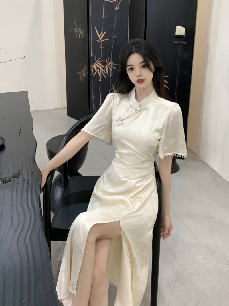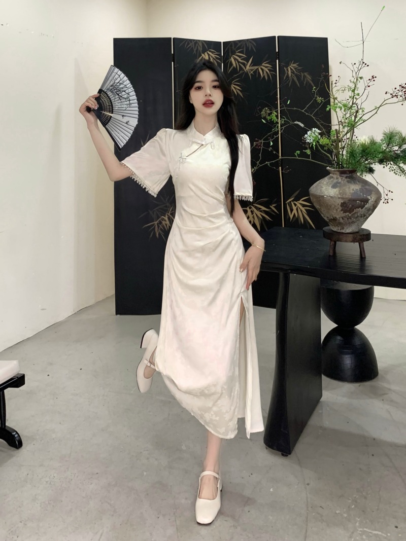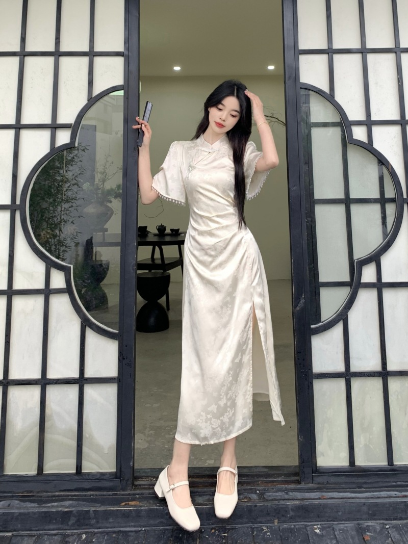 白の逆大袖長袖チャイナドレス秋冬日常改良民国大お嬢さんの絶美気質高級感