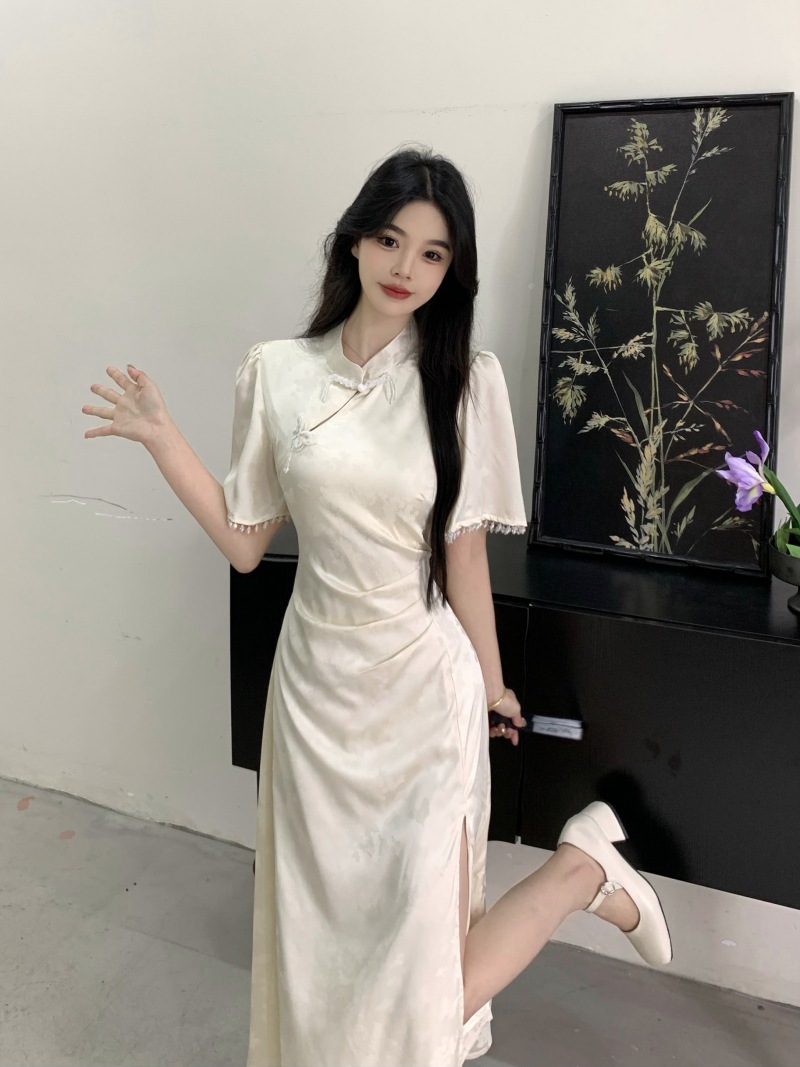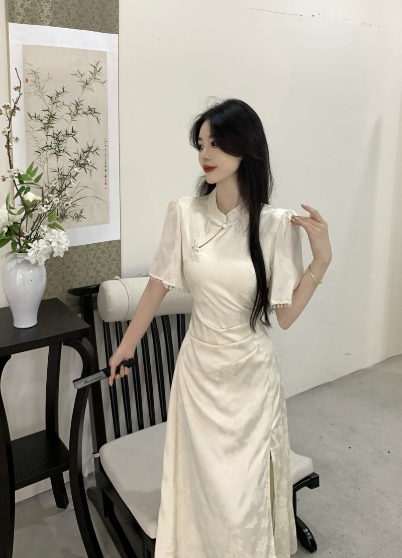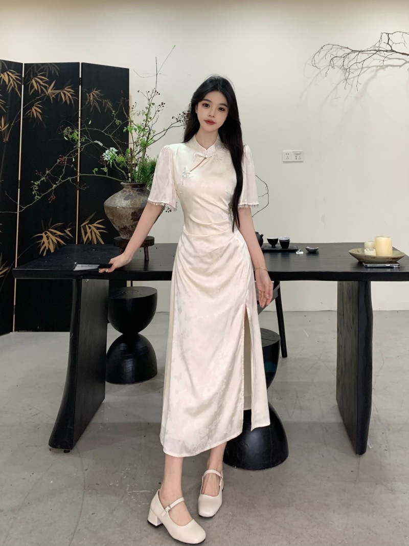 新しい中国式のチャイナドレスの透かし彫りの低い胸の半袖のワンピースの女性の夏の純粋な欲のセクシーな腰の包みのお尻のオープンフォークの長いスカート