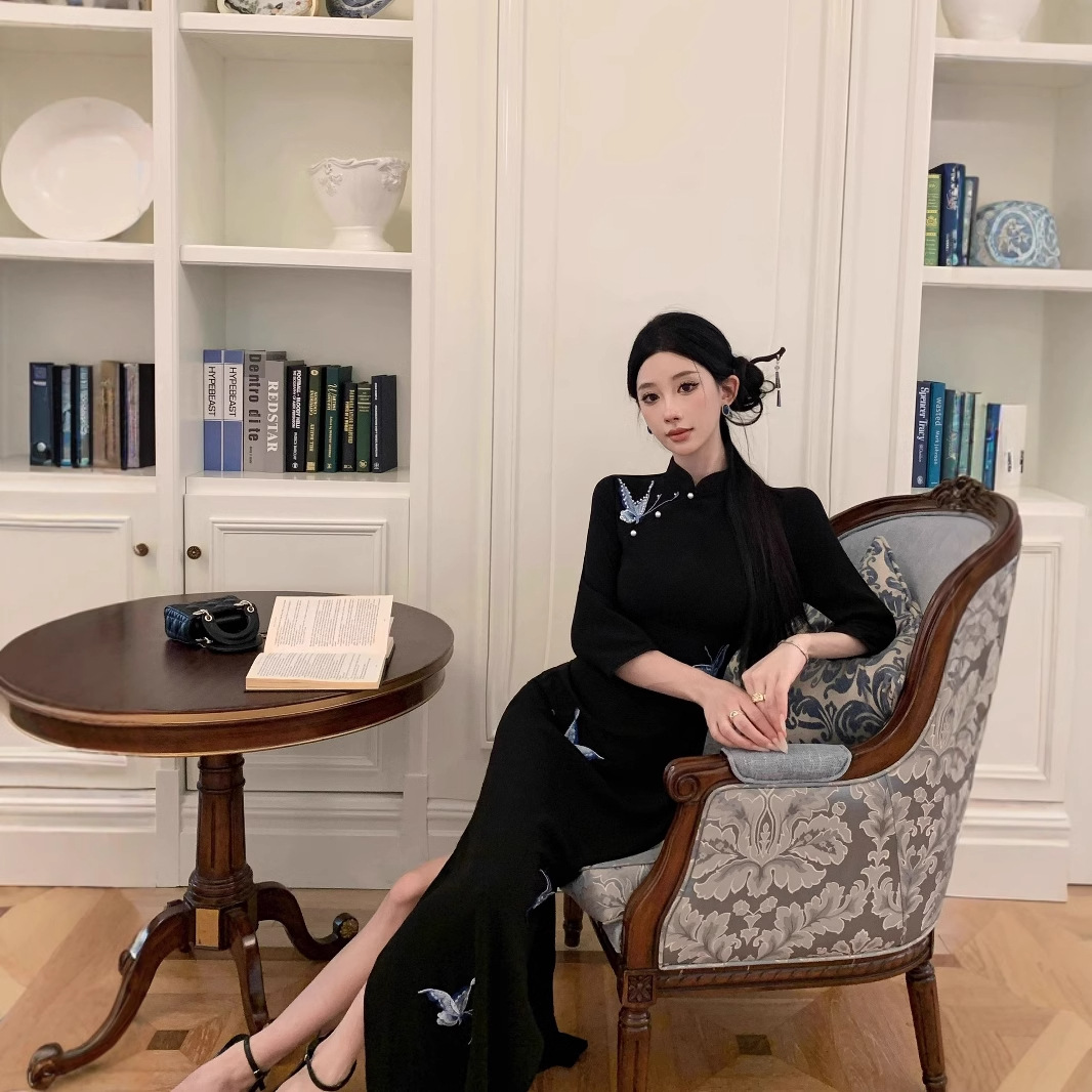 復古風新中国風蝶2024新改良チャイナドレス超気質痩せ長袖黒ワンピース