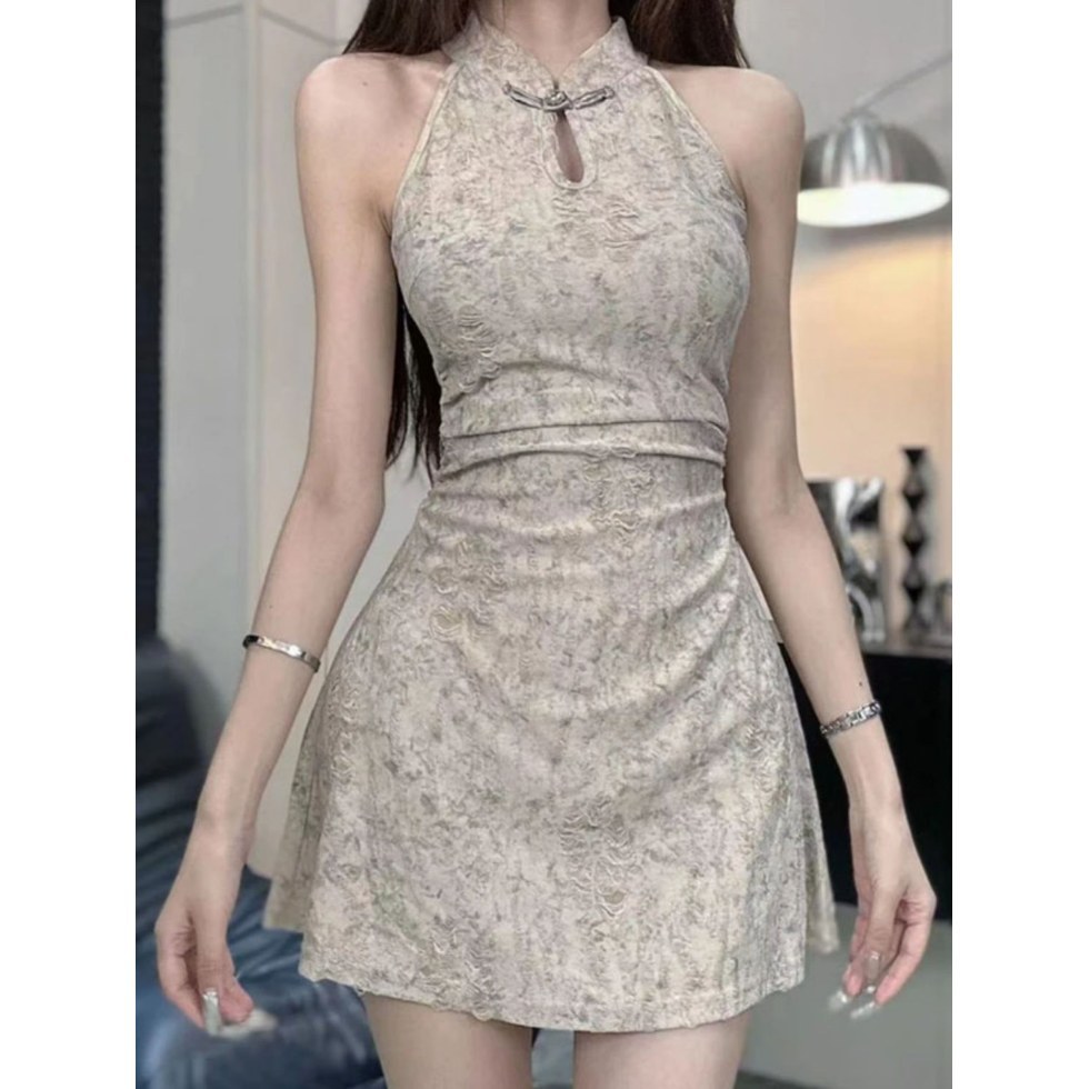 新中国風の国風の袖なしの首のワンピースの女性の夏の大衆の設計は腰を収めてやせているギャルの肩の短いスカートを現します。