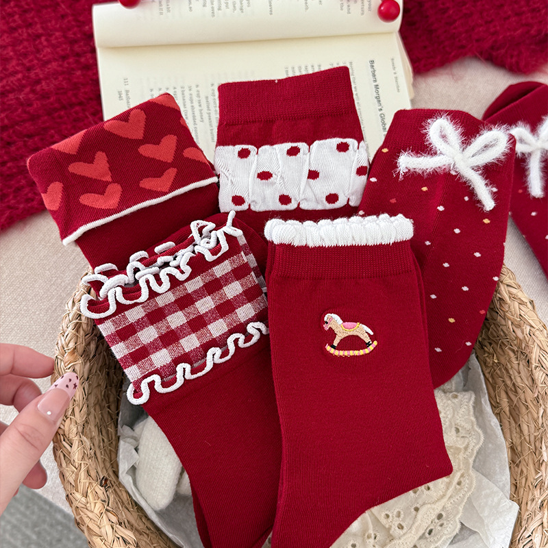 诸暨秋冬红色系长袜女一体机无骨四季款女袜ins花边蝴蝶结新年红