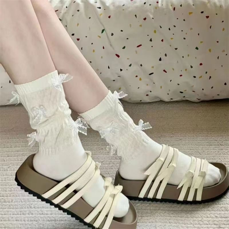 諸暨ソックス レディース 夏 薄手 通気性 メッシュソックス インス風 リボン付き JK風 パイルソックス ロングソックス 卸売