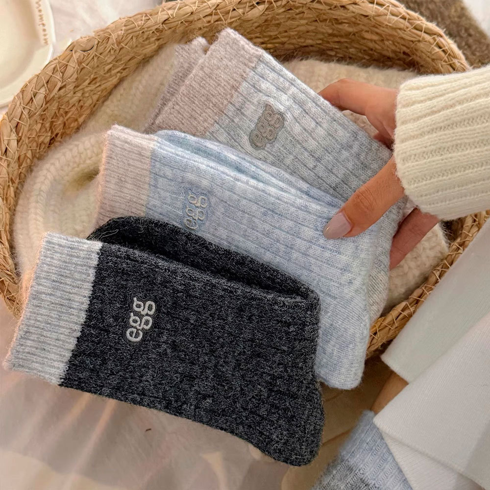 袜子女秋冬款保暖加厚羊毛撞色刺绣女袜ins韩系中筒堆堆袜袜子女