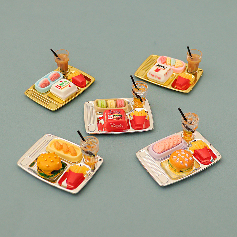 子供の家のミニ食事は食事の皿の模型を遊んでハンバーガーミルクティーの装飾品のシーンを並べます。