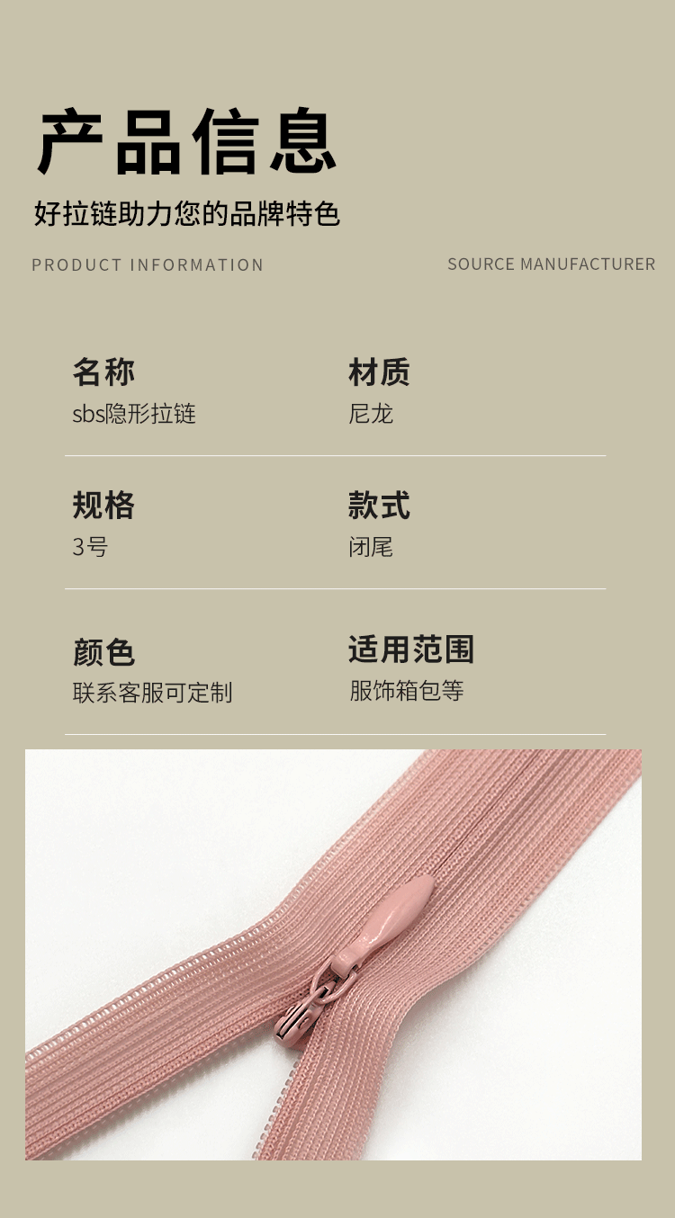 純正品卸売り3号閉鎖尾sbsステルスファスナー抱き枕スカートステルスファスナー水滴頭引きセルフロック