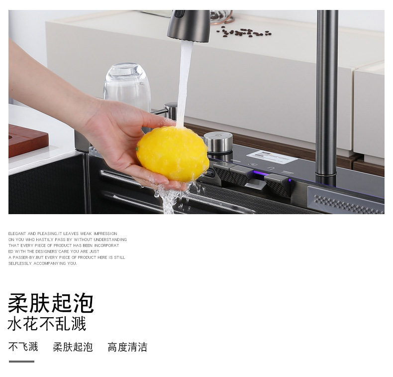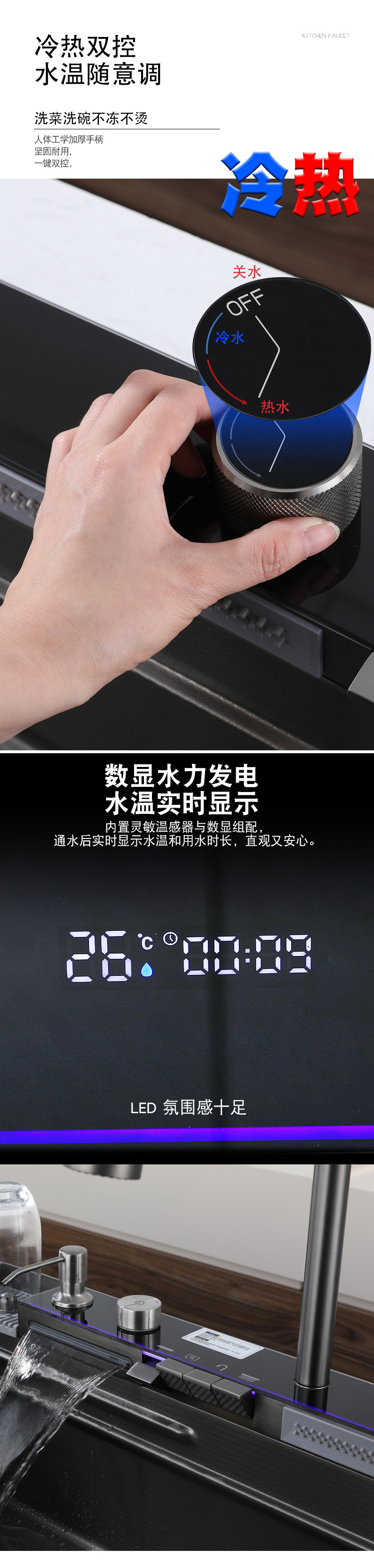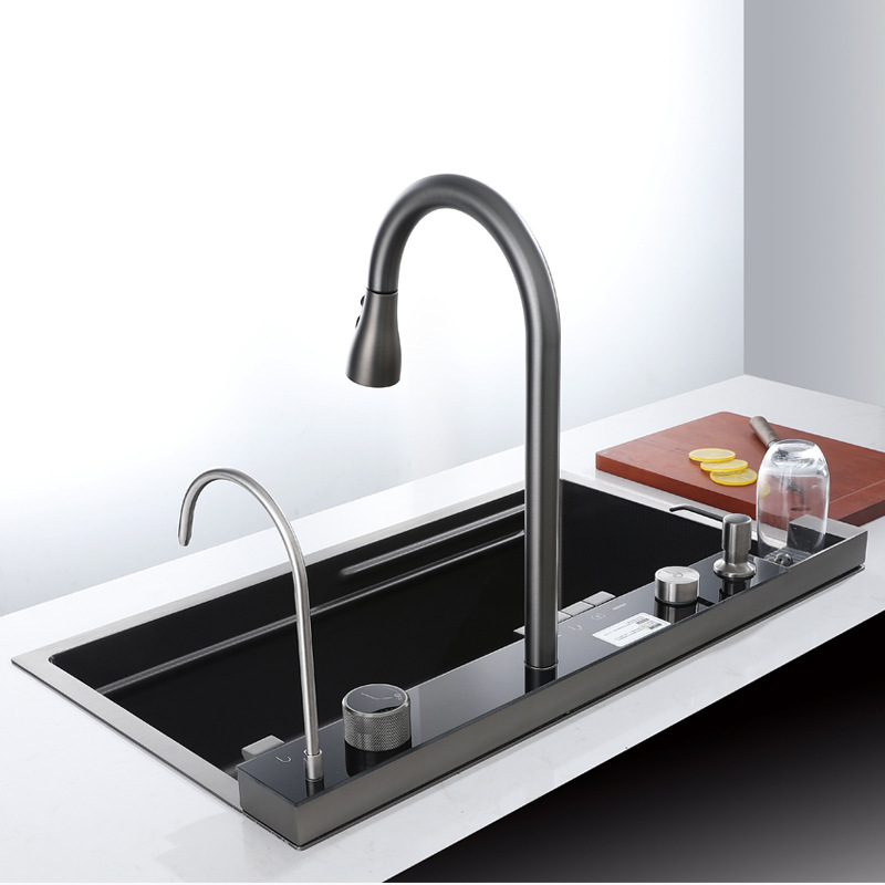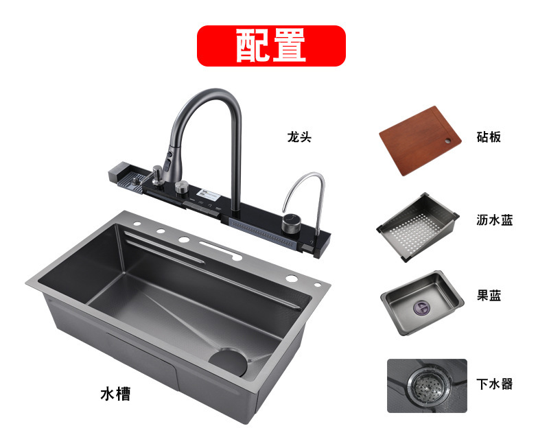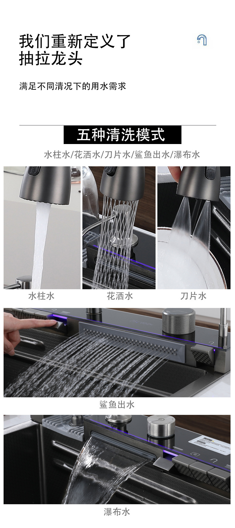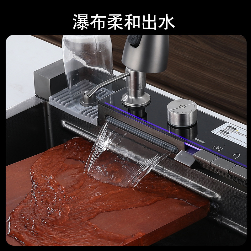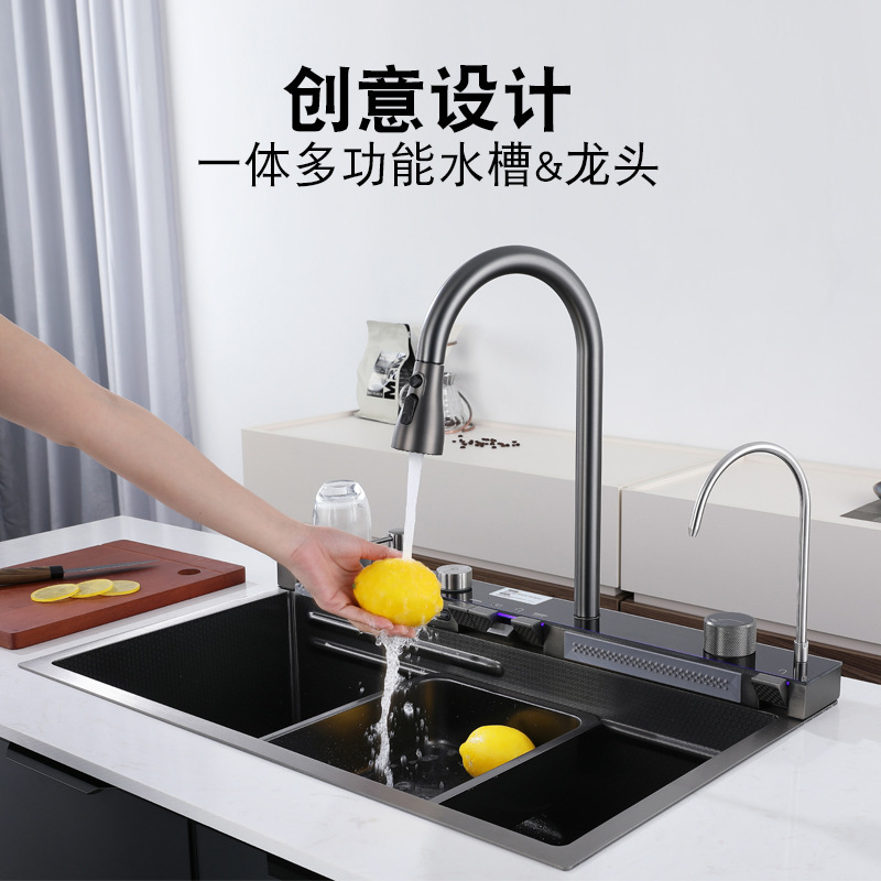 外贸鲸鱼钢琴数显飞雨瀑布水槽大单槽蜂窝纹304不锈钢厨房洗菜盆