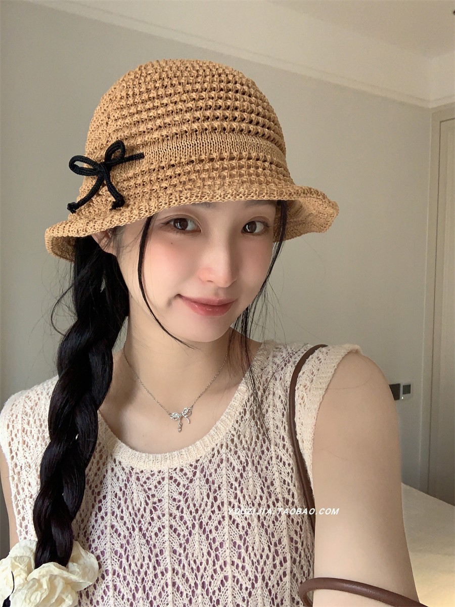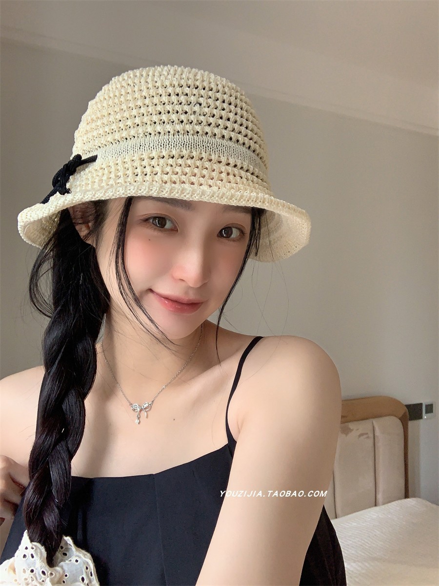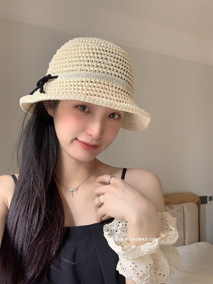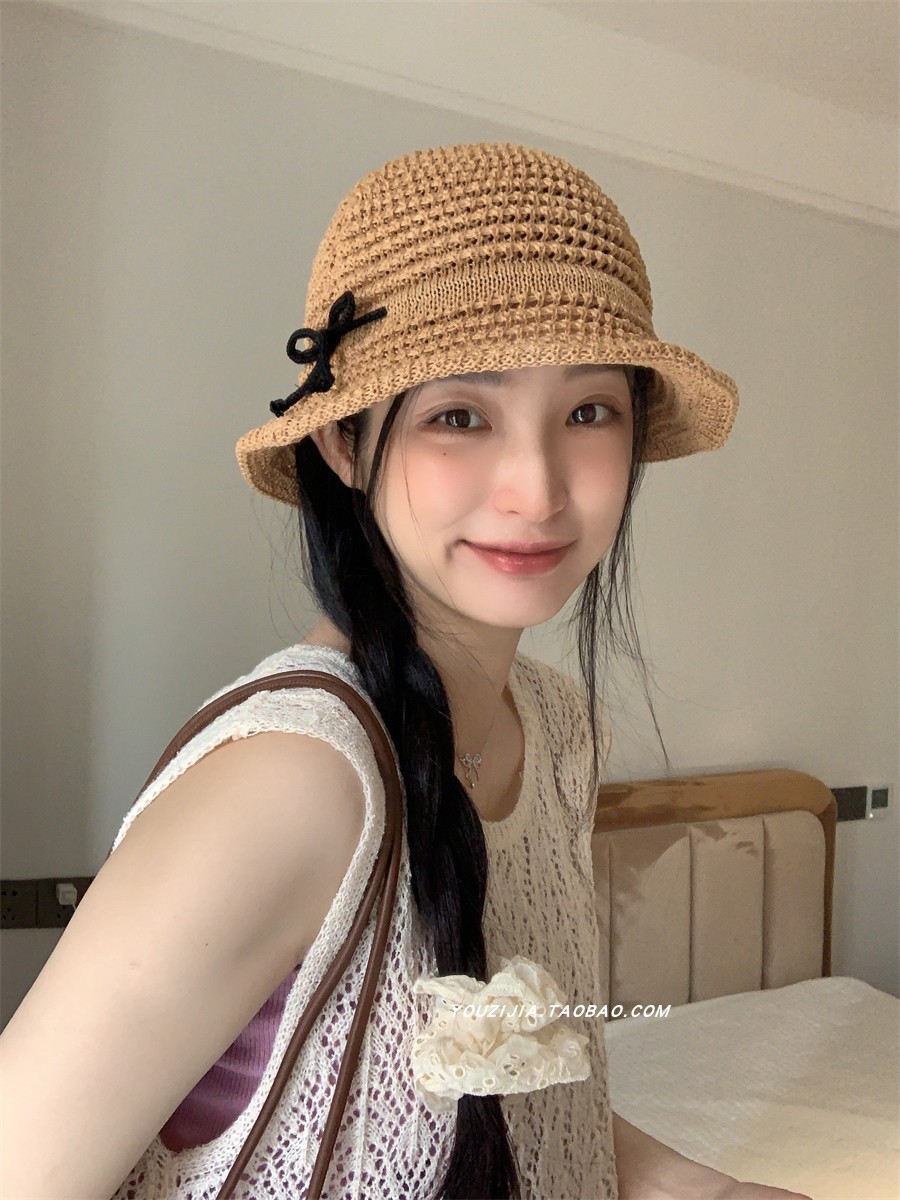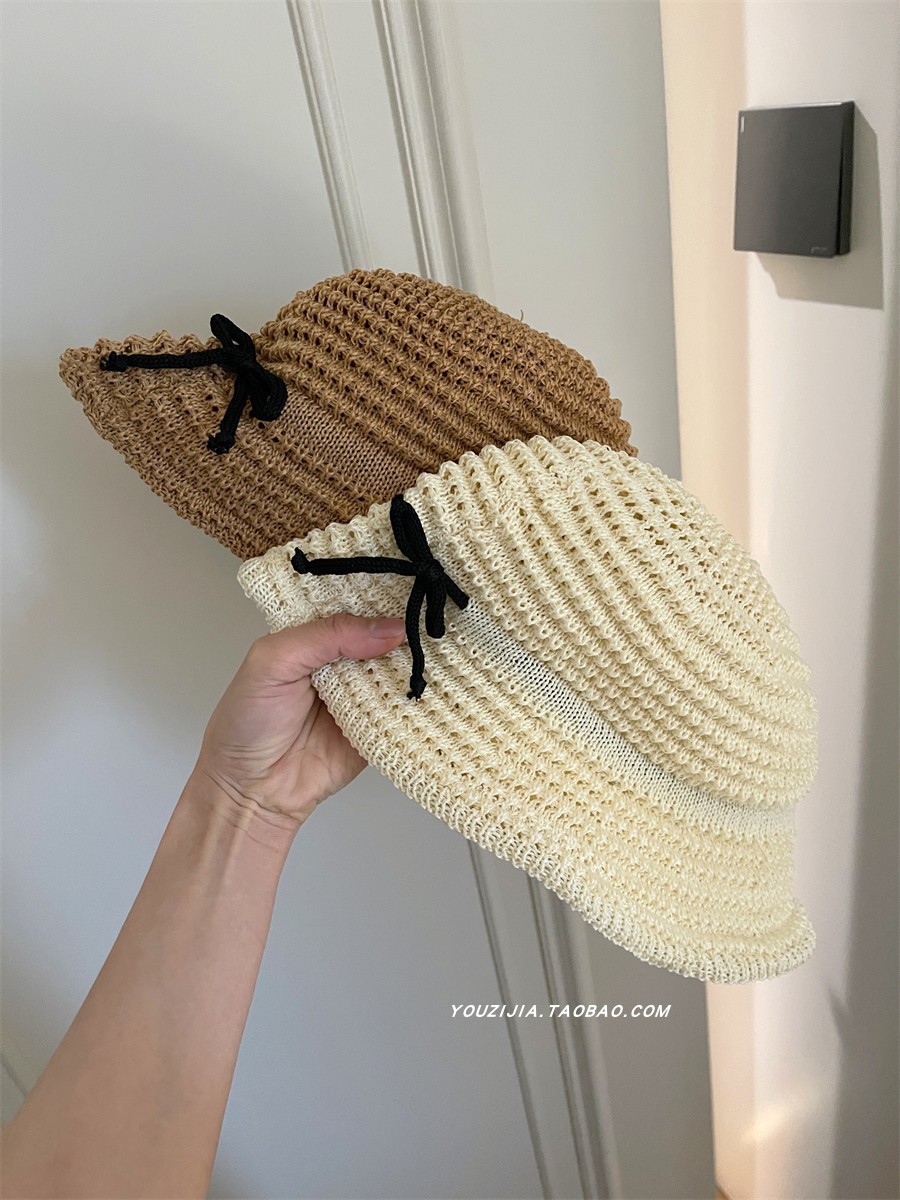 韓国版ins甘い蝶結びの透かし彫りの丸みを帯びた麦わら帽子