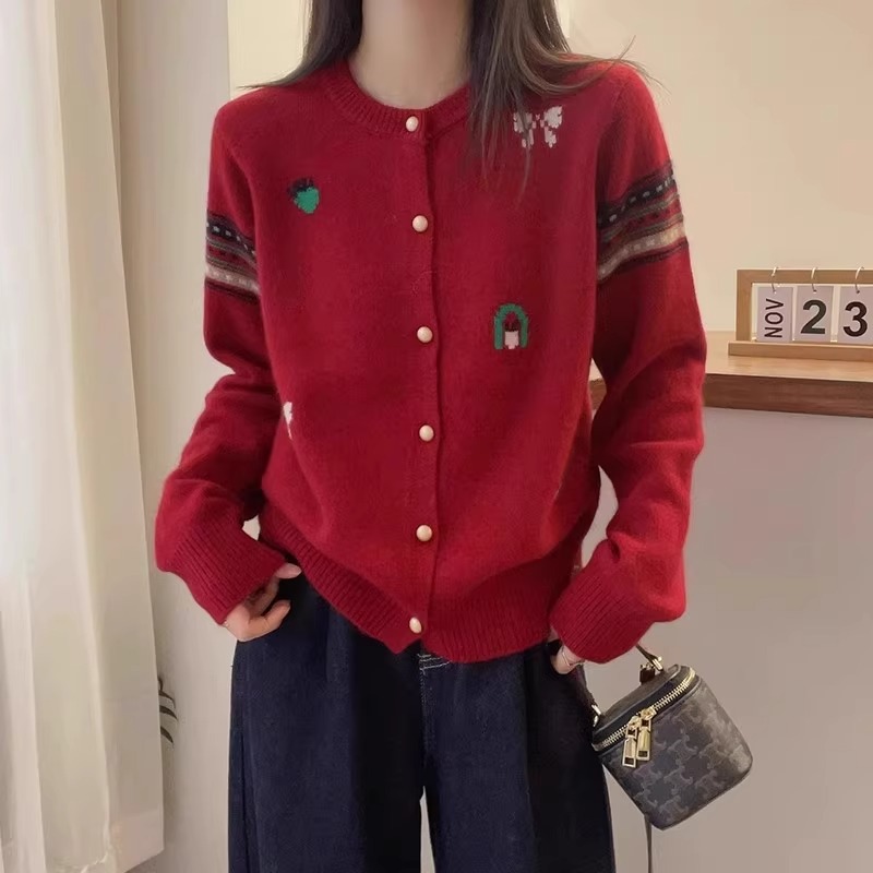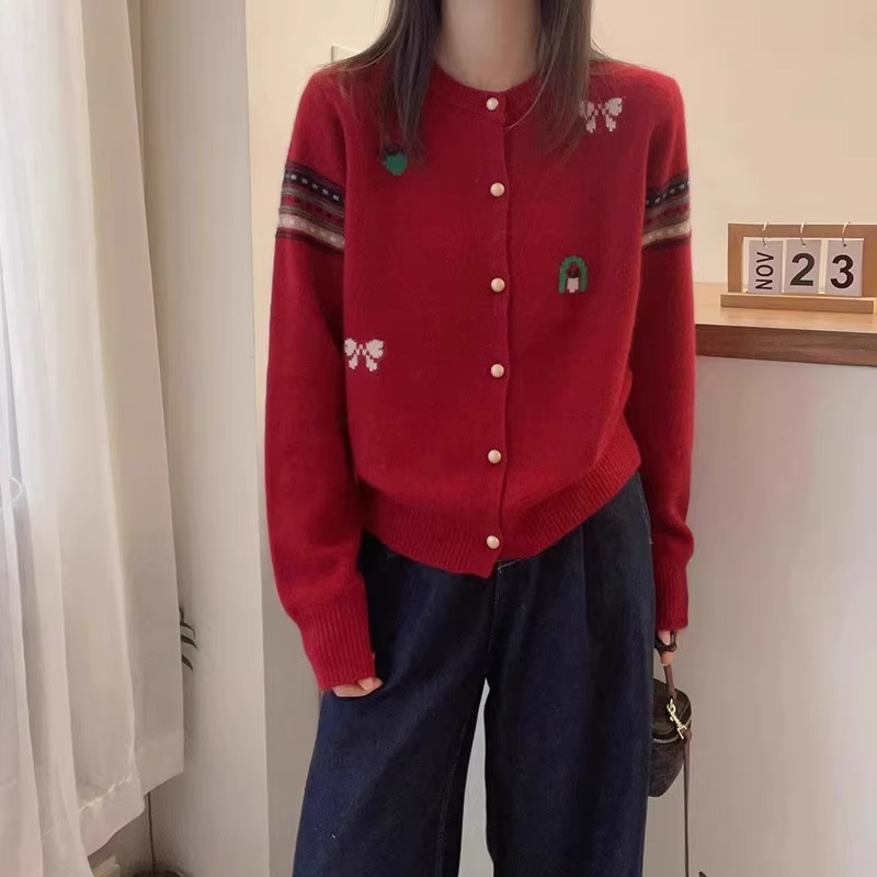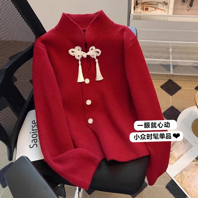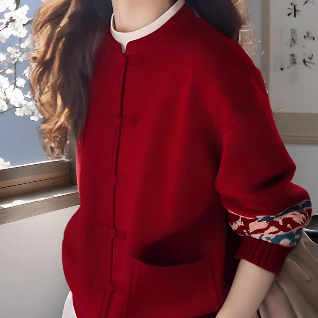 2024龍年優雅気質丸首上着ニットカーディガン新中国式ボタンデザイン感赤いセーターコート