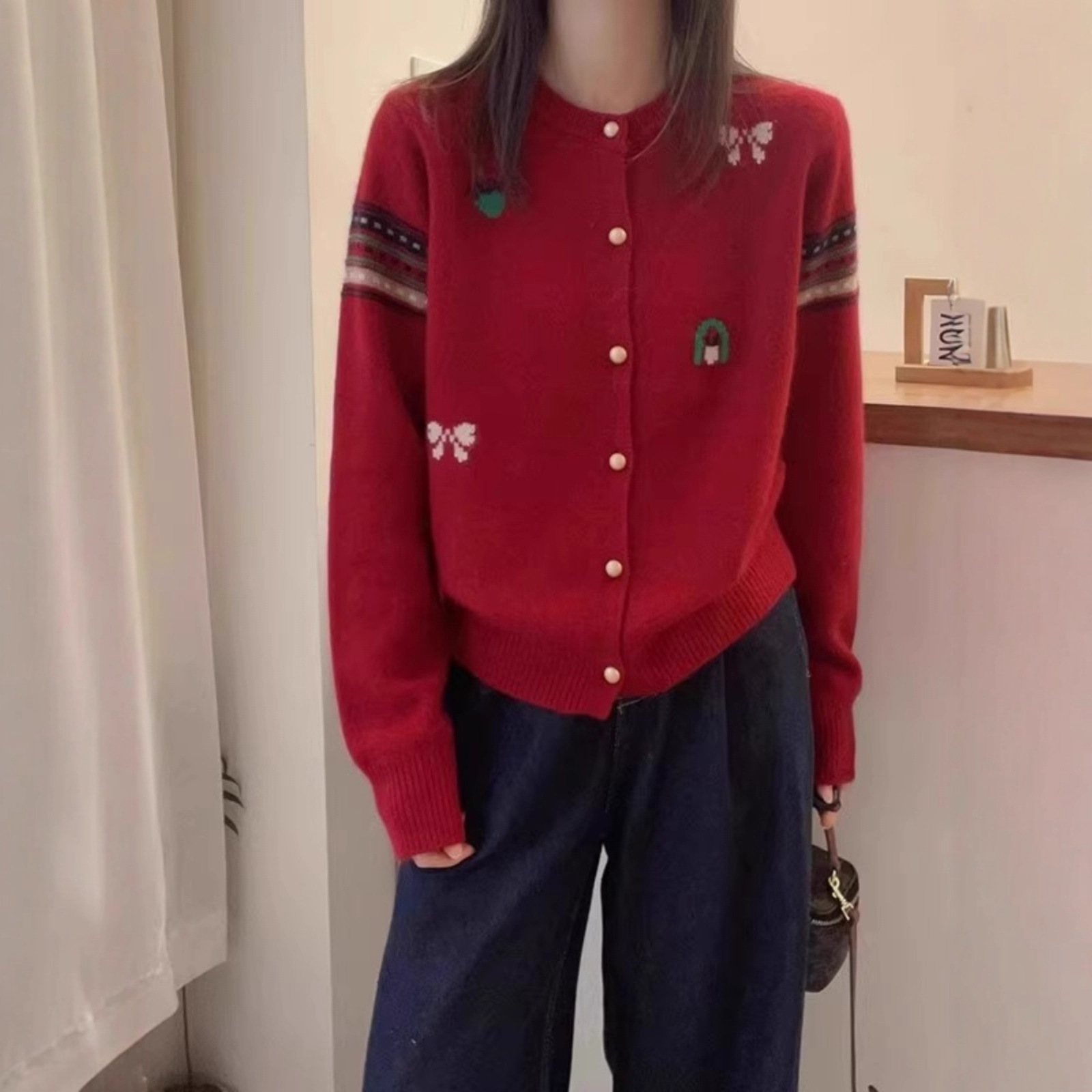 赤いセーターのコートの女性2024春秋本命年龍年服新中国式国風ニットカーディガン新年春