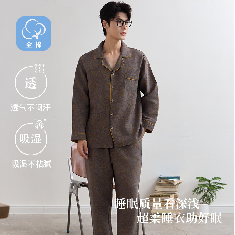 メーカー直供純綿男性パジャマセットゆるい春秋二重ガーゼ大サイズ綿縮み長袖卸売り