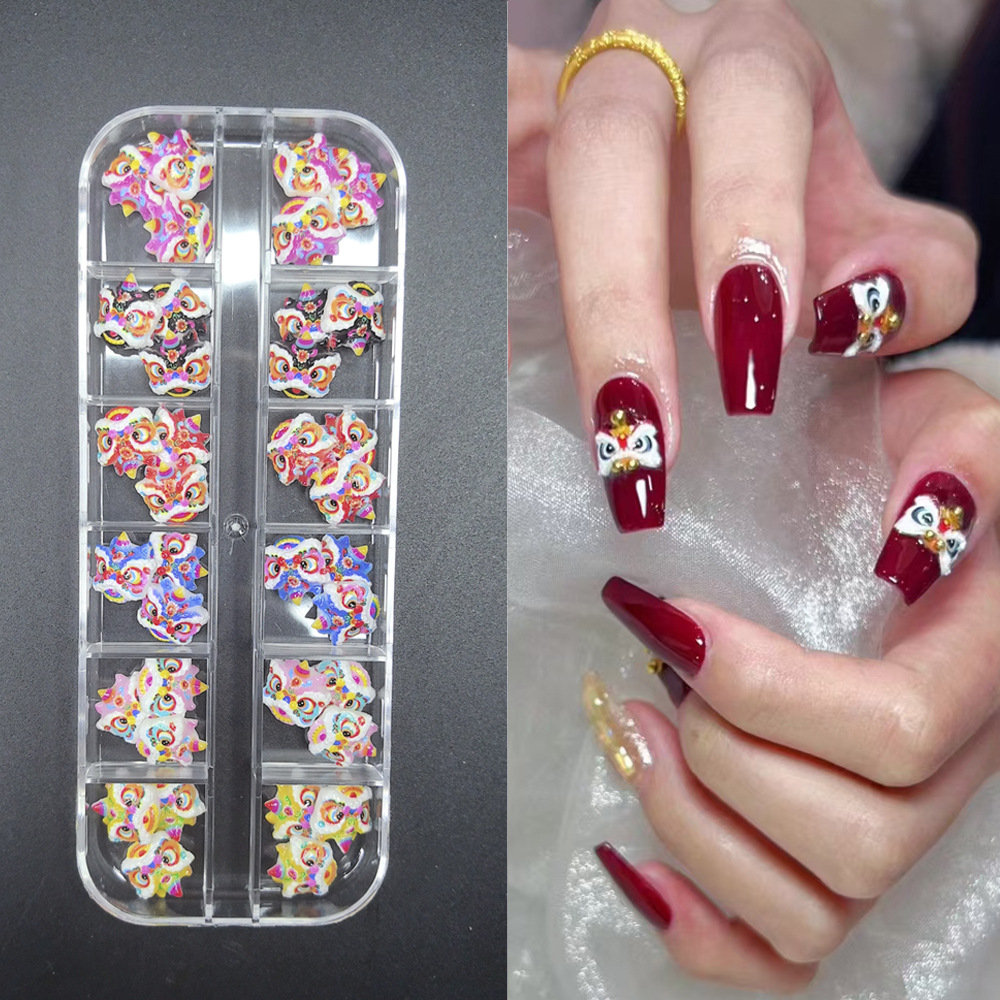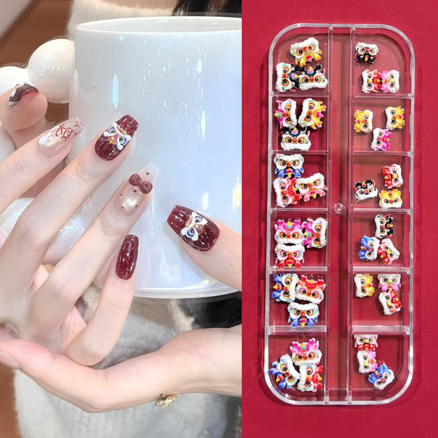 12格新年国潮ネイルアート闘眼覚醒ライオンDIYクリームゴム部品旧正月装飾品招財漢服アクセサリー