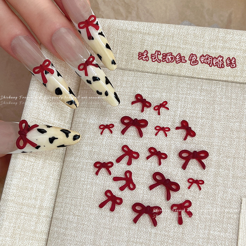 50粒【ギャル風】豹紋フレンチ蝶結びネイルアクセサリーミニワイン赤蝶結び合金塗装飾り