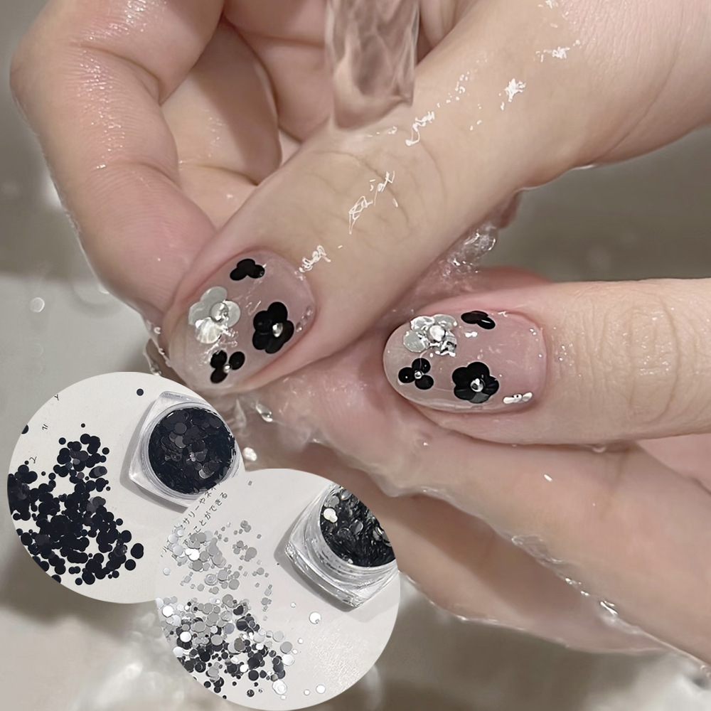 银色圆形波点拼花亮片大小混装美甲饰品复古繁花黑色亮片美甲闪片