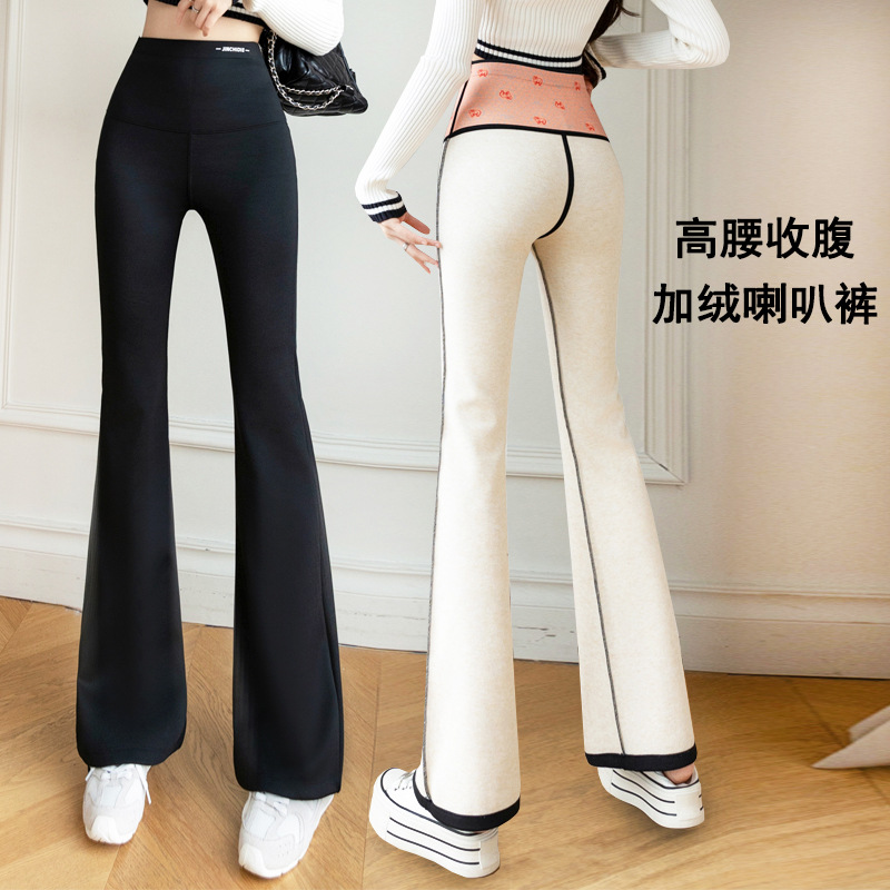 新款加绒微喇裤高腰双口袋黑金提臀鲨鱼喇叭裤外穿加长大码打底裤