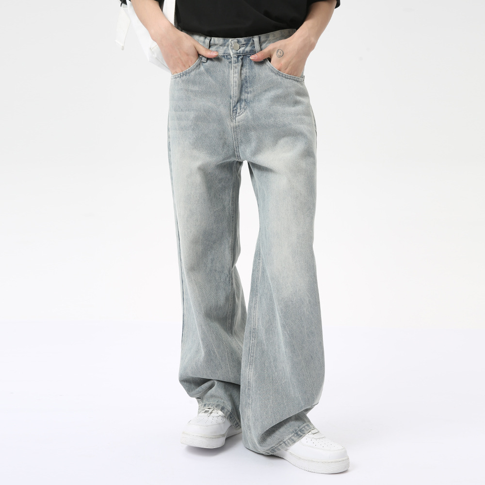 MTLCLOTHESメンズウェア | 韓国風ルーズフィット万能ウォッシュドブルーのストレートワイドデニムパンツメンズカジュアルデイリー