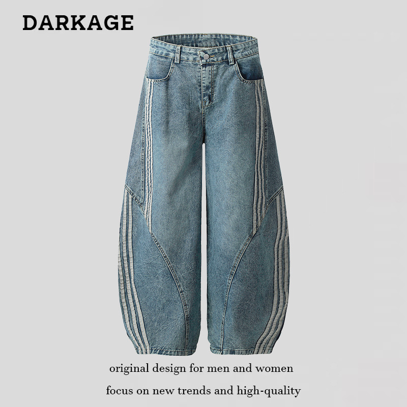 2025 新しいアメリカンレトロスプライシングウォッシュ加工ダメージジーンズ男性と女性のためのルーズワイドレッグストレートフロアレングスパンツ