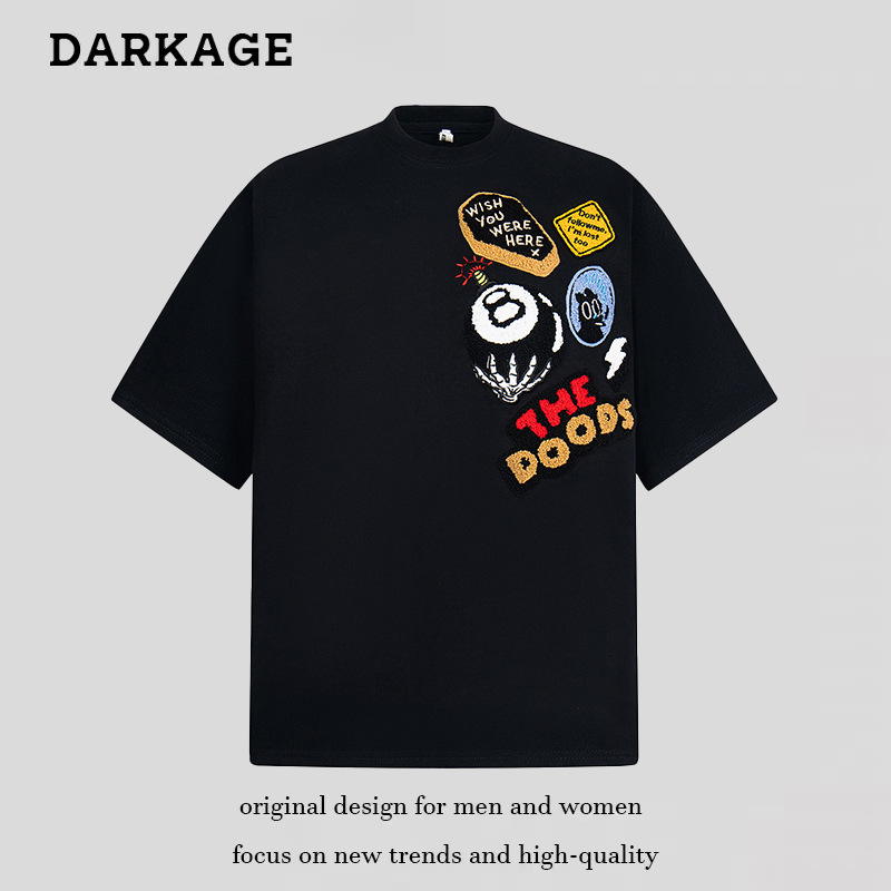 アメリカの街頭バッジ植毛刺繍tシャツ男女ゆるい高街カップル重ポンド純綿夏新半袖