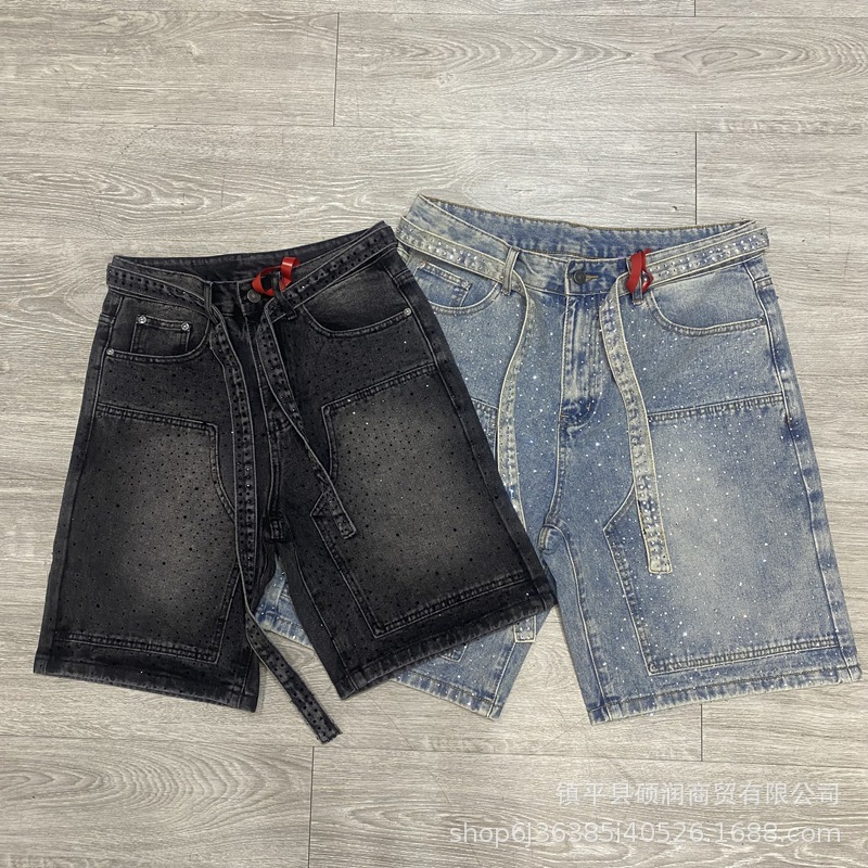 ヨーロッパとアメリカのクロスボーダーハイストリートダイヤモンドがいっぱい 2025 新しいヒップホップクロスストレートホットダイヤモンドデニムショートパンツ 5 点ジーンズ