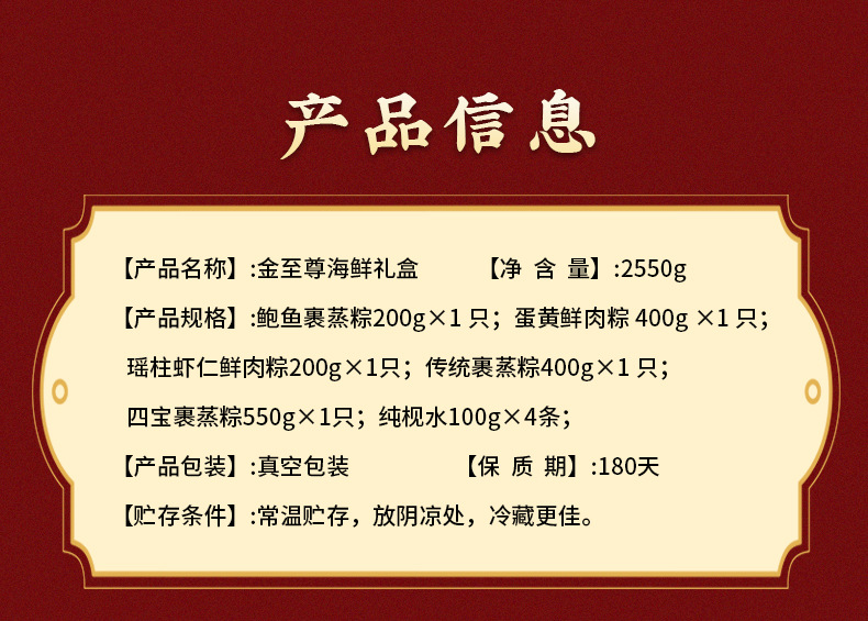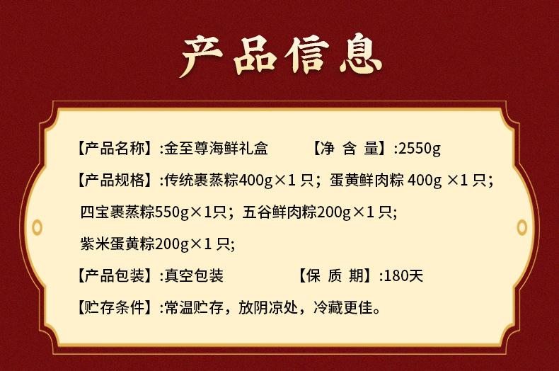 正味含有量 (仕様) 金至尊海鮮ギフトボックス2550g,元皇鮑福ちまきギフトボックス2000g,蒸しギフトボックス2000g,ちまき望所帰礼箱1000g,ちまき情ちまき意礼箱1600g,鴻運頭礼箱1600g,五福臨門ギフトボックス1800g,五穀豊登ギフトボックス1333g,紫気東来礼箱1100g,順風満帆ギフトボックス798g