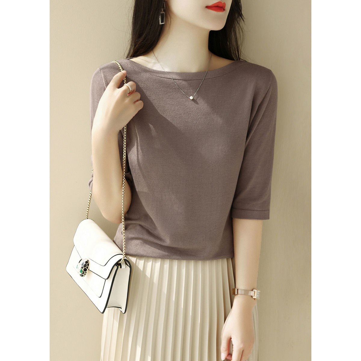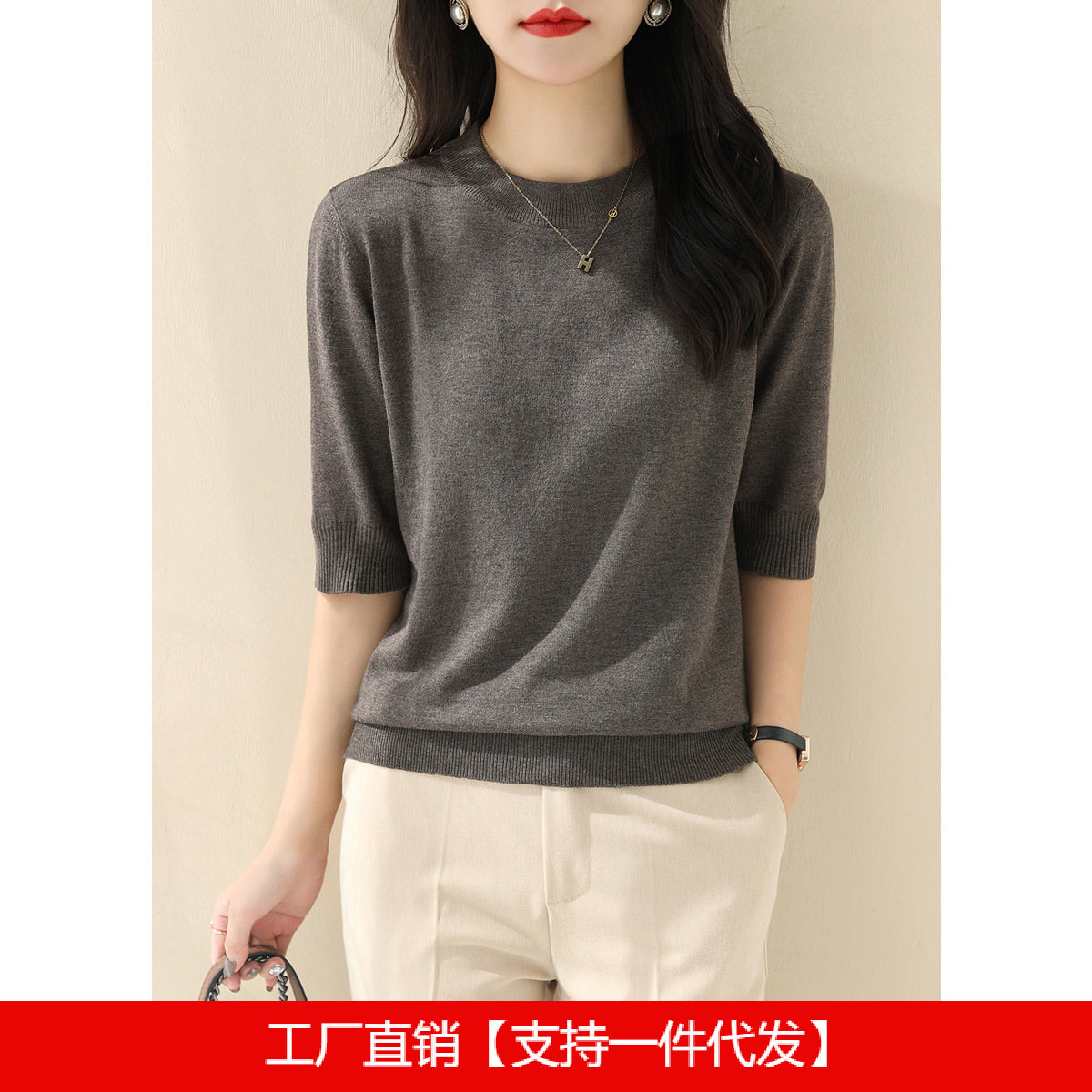 新しい純色の中袖の気質の知的なメリヤスの婦人服の2024夏の半高の丸首の5分の袖のゆったりしている上着