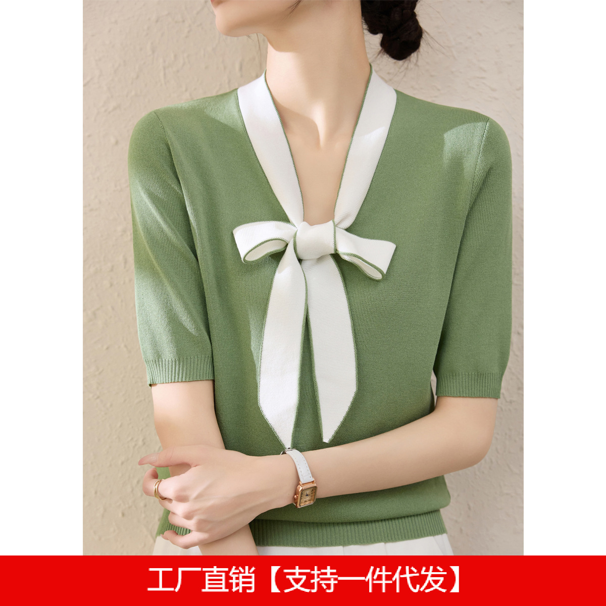 夏の新しい女性用アイスシルクセーター、通気性、多用途、痩身、カラーブロック、蝶ネクタイデザイン、ミッドスリーブトップ