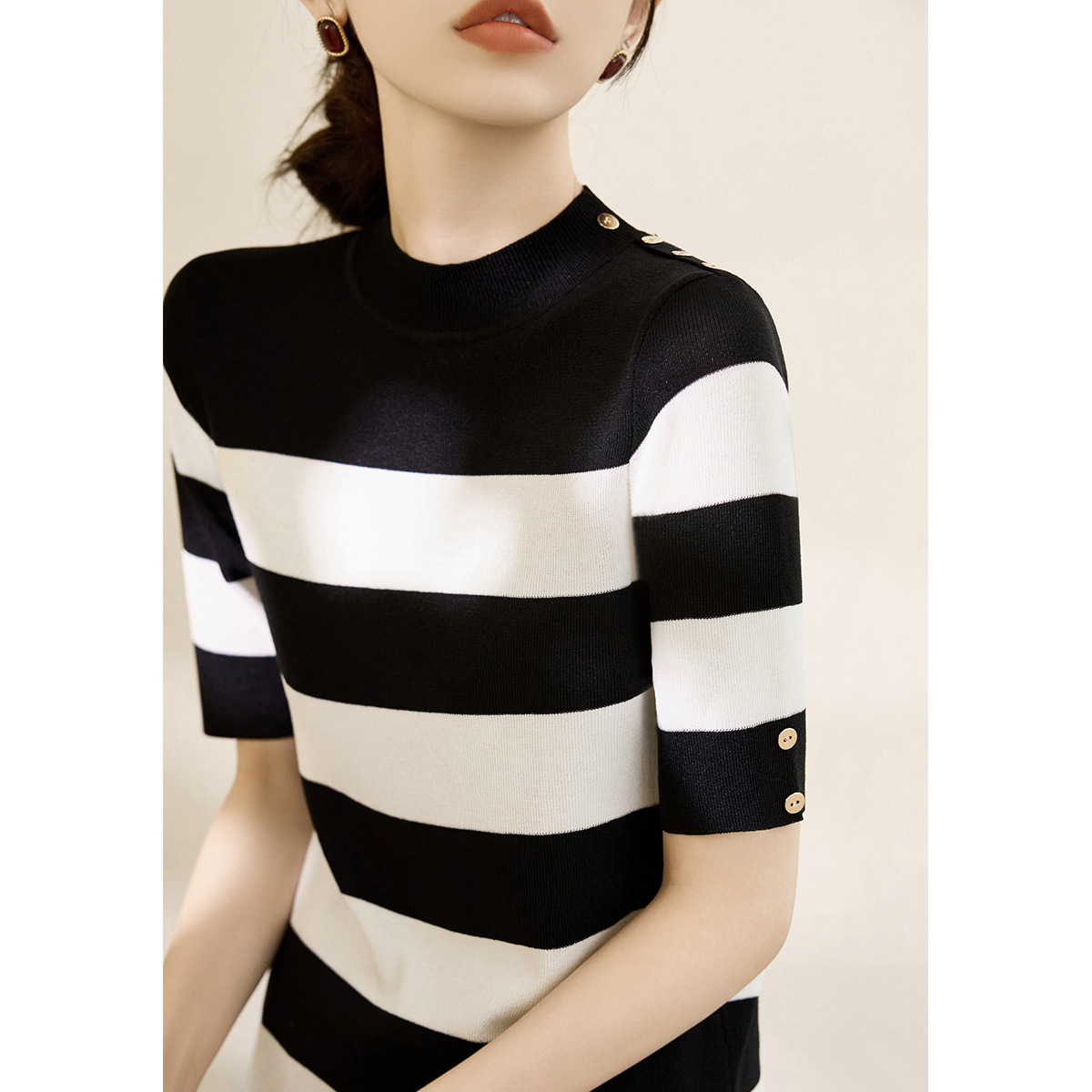 2025春の新型気質半高襟ボタンデザインニットシャツ白黒五分袖上着女性