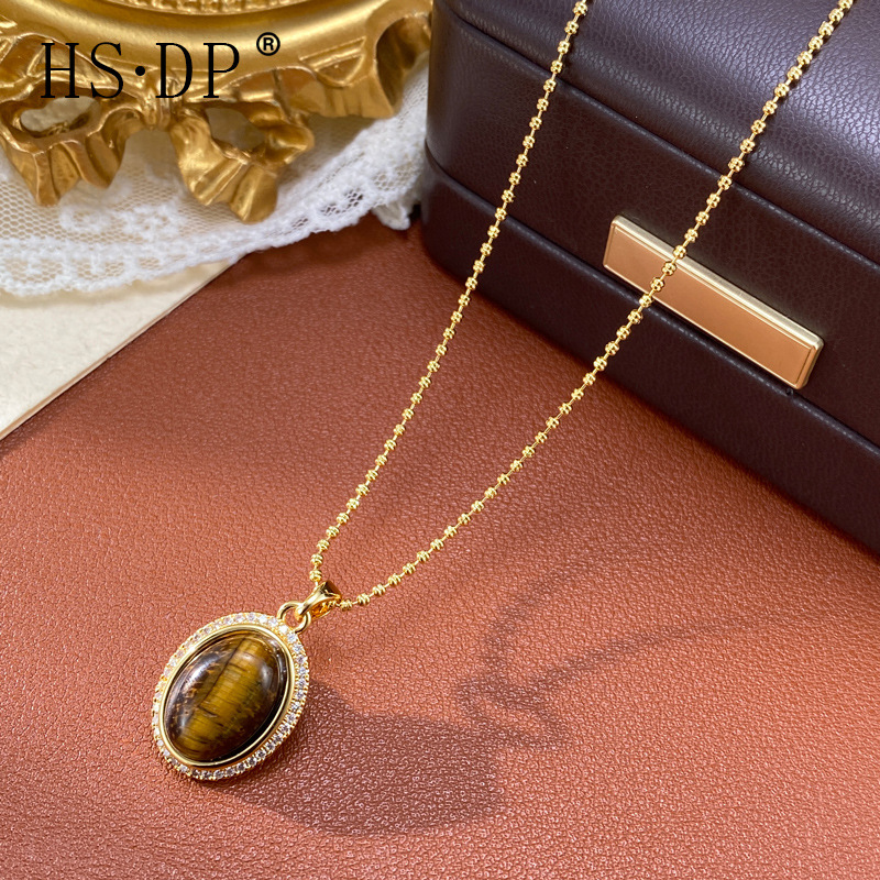 美拉德锆石椭圆虎眼石吊坠项链气质时尚个性简约复古百搭颈链批发