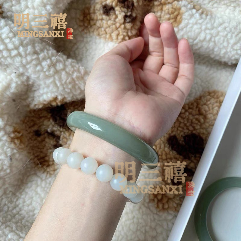 天然アイスグリーンホワイト翡翠ブレスレット、女性用フラットバーティカルジュエリー、晴水フォーマルラウンドバーニッチ翡翠ブレスレット卸売