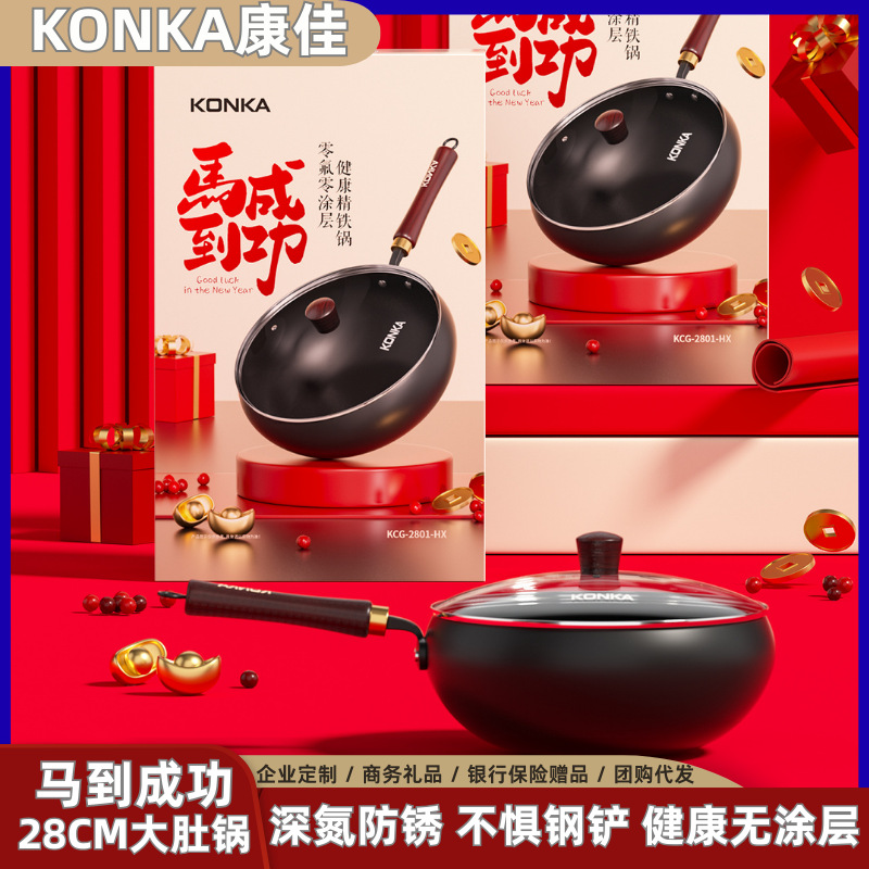 2026年新款康佳马到成功大肚锅无涂层精铁锅加厚耐磨家用平底炒锅