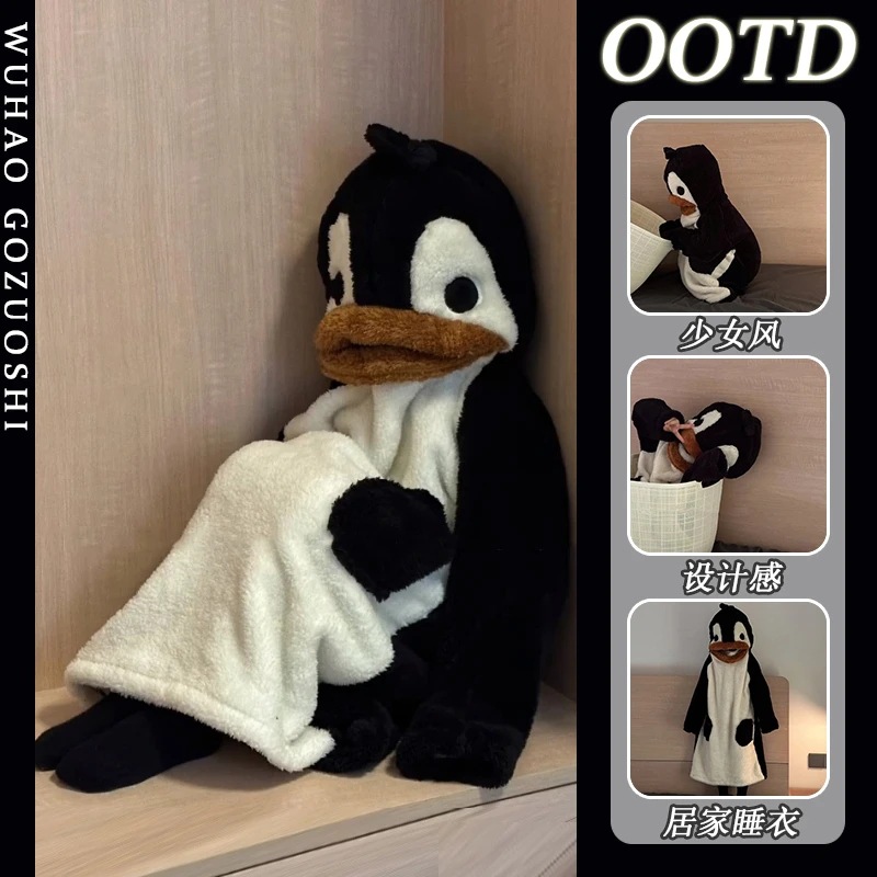 かわいいペンギンのサンゴのパジャマの女性秋の冬の新しい砂の彫刻の漫画のベルベットの厚い毛の家の服