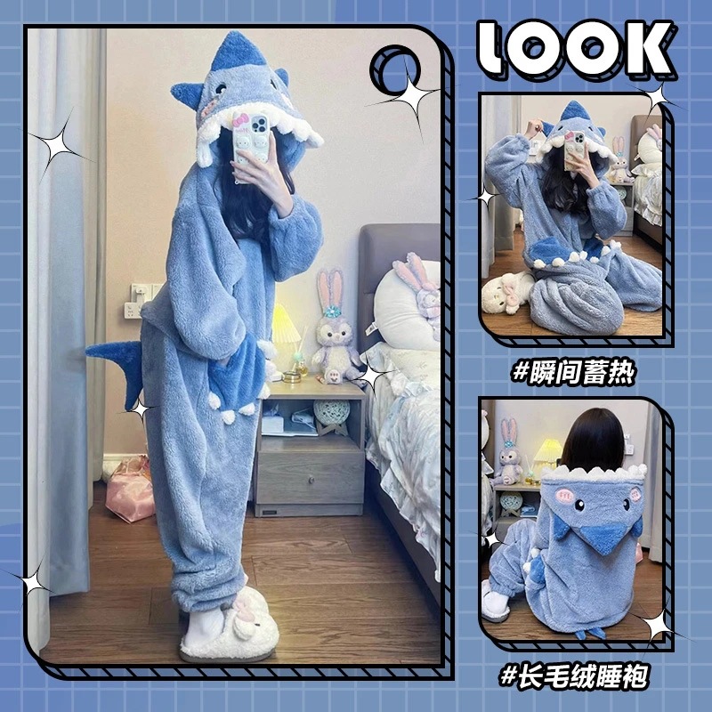 かわいいサメのサンゴの毛のワンピースのパジャマの女性秋冬2025年の新型の厚い保温の一体式の家庭服