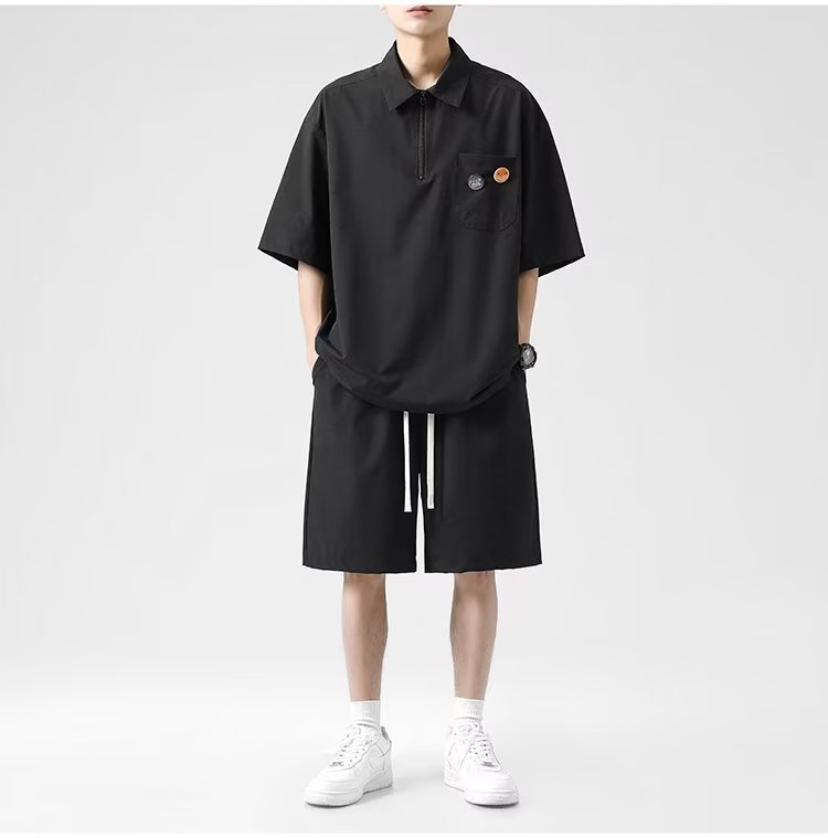 灰色时尚polo衫男士短袖t恤夏季薄款速干潮牌运动服宽松短裤套装