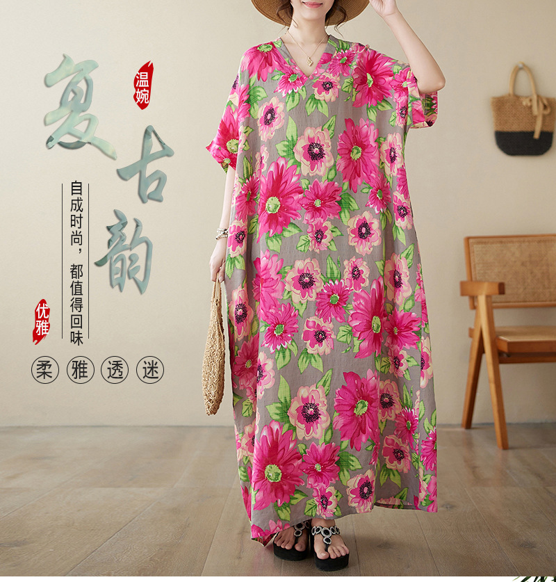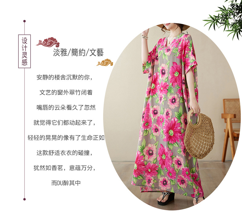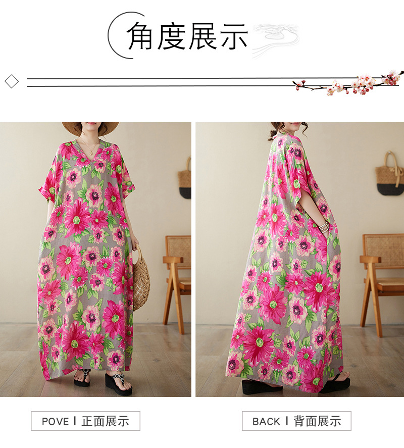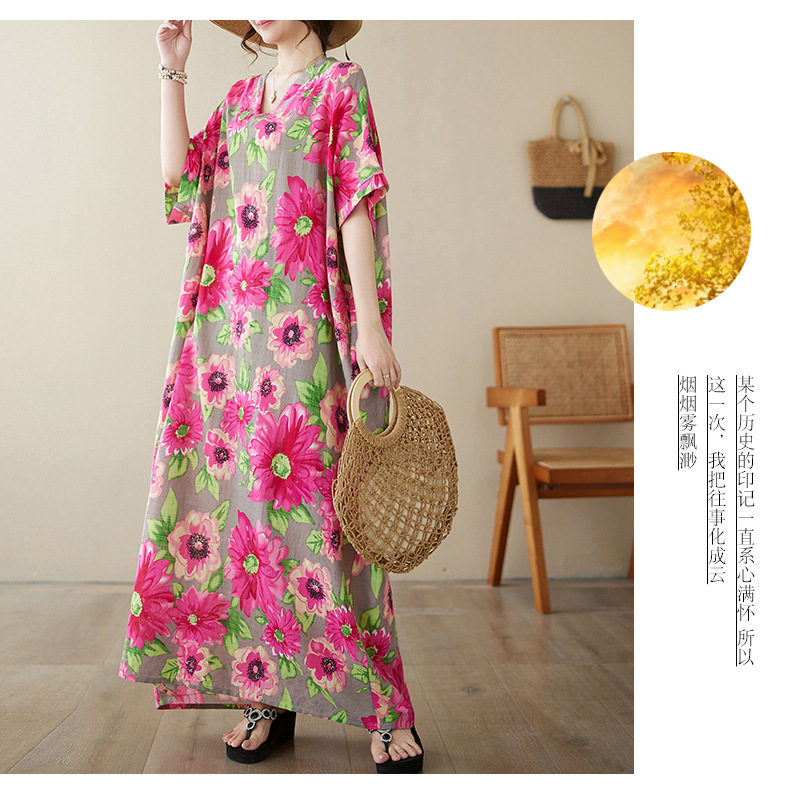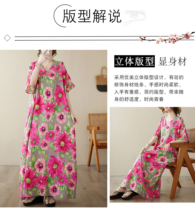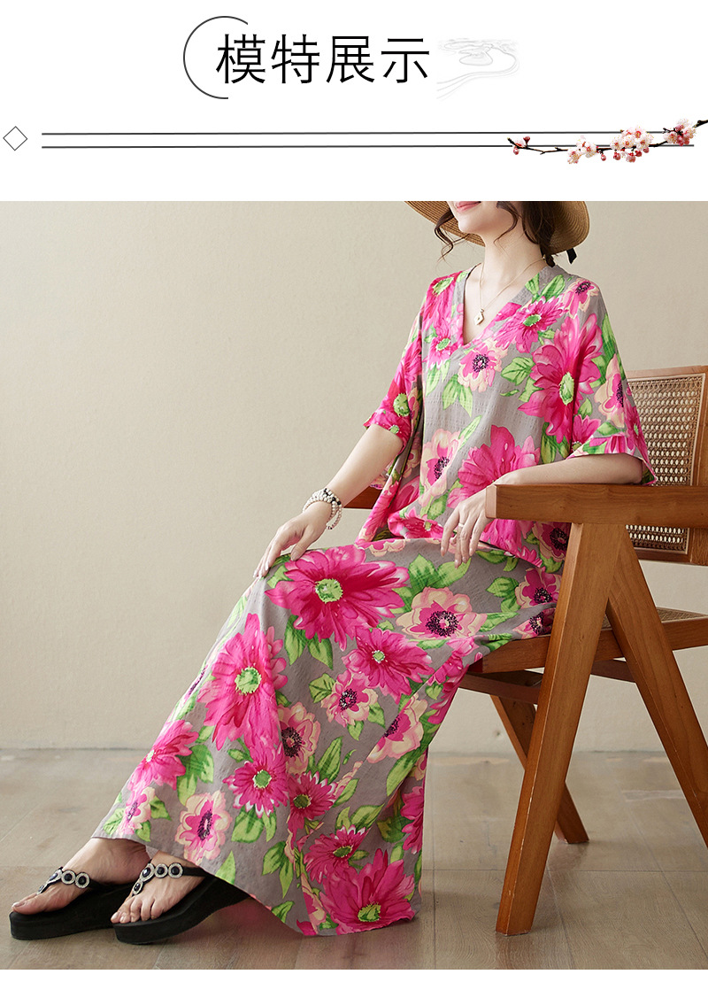 外贸大码文艺花色度假风旅游V领复古长裙宽松遮肉棉麻印花连衣裙