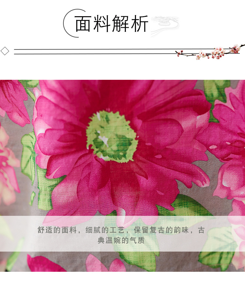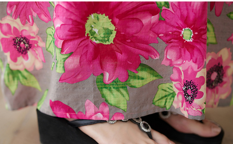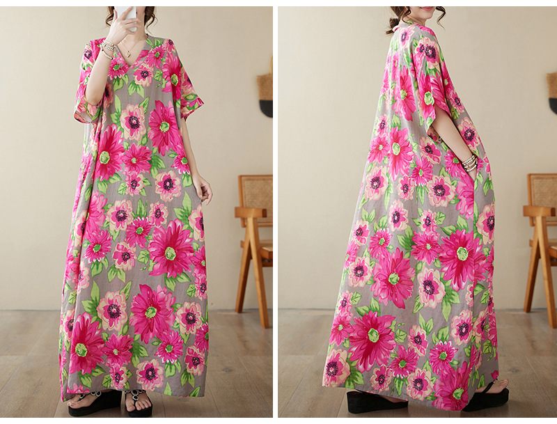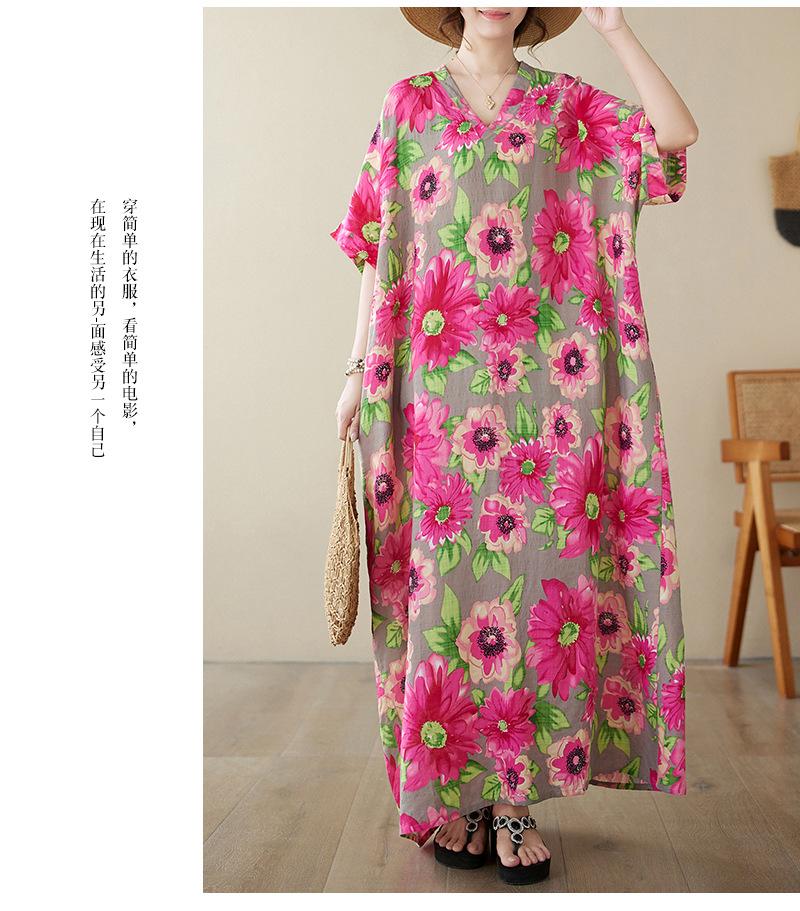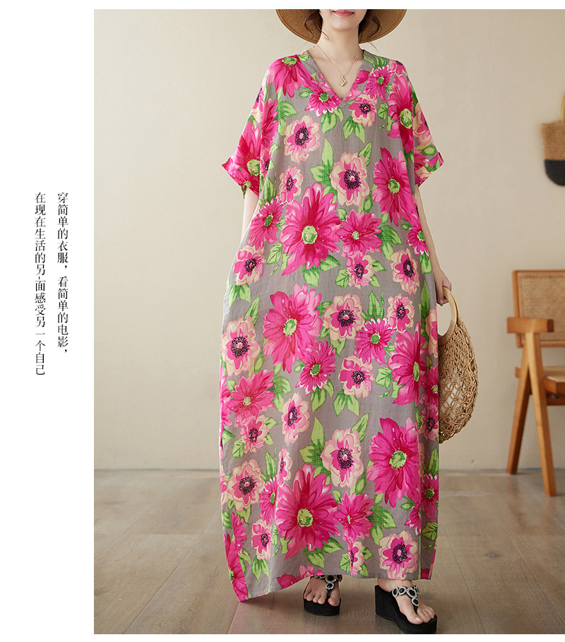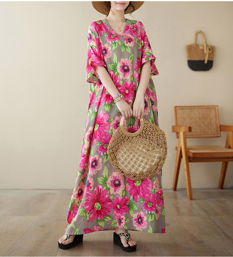 外贸大码文艺花色度假风旅游V领复古长裙宽松遮肉棉麻印花连衣裙