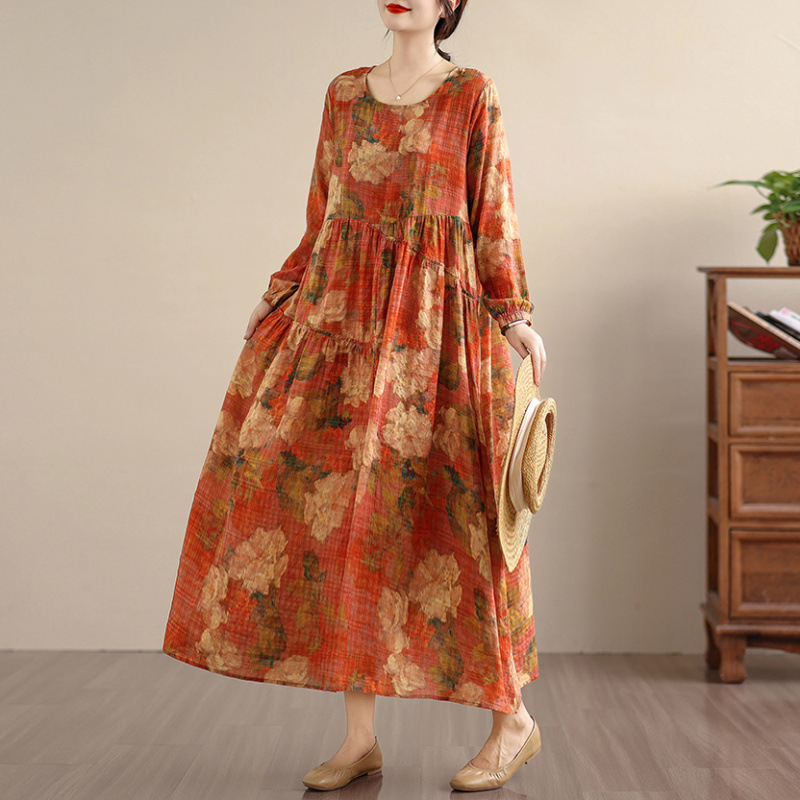外贸大码复古文艺印花连衣裙女春秋长袖亚麻棉长款大摆宽松花边裙