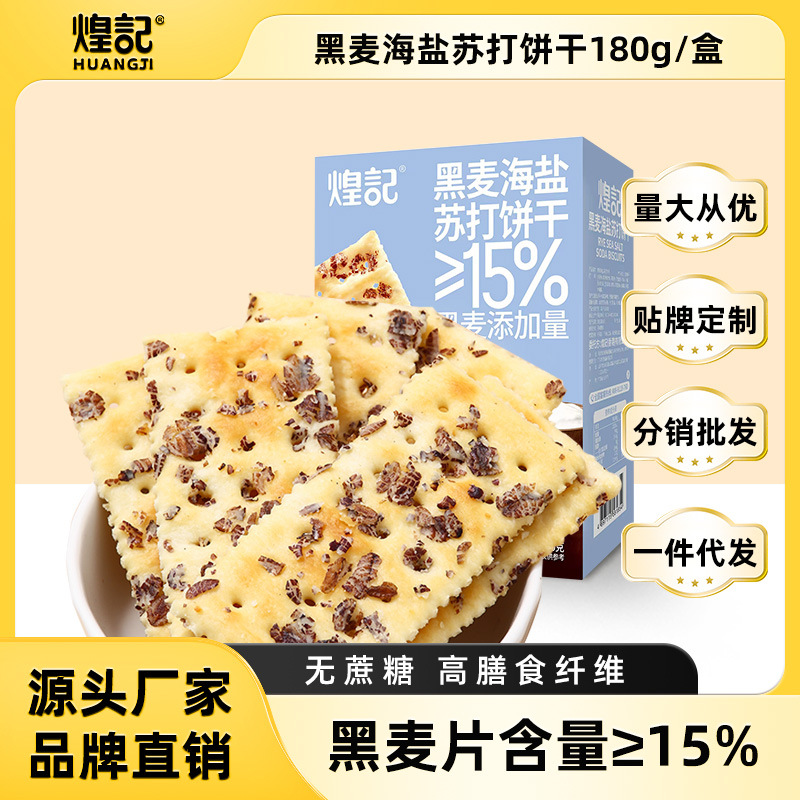 煌記新商品の黒麦海塩ソーダビスケット0ショ糖0トランス式脂肪酸180g箱に入っています。
