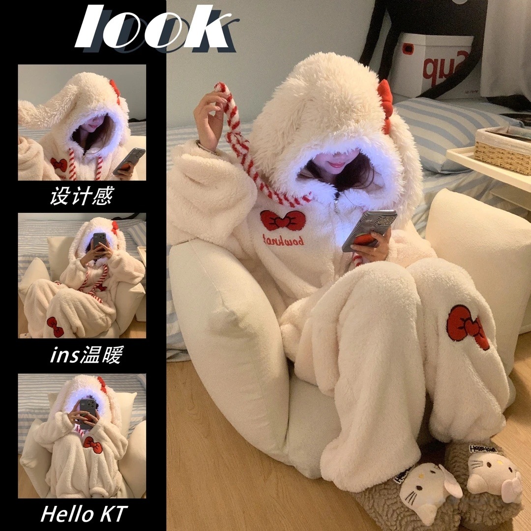 2025年新款秋冬季可爱蝴蝶结兔子连体珊瑚绒睡衣女加绒加厚家居服