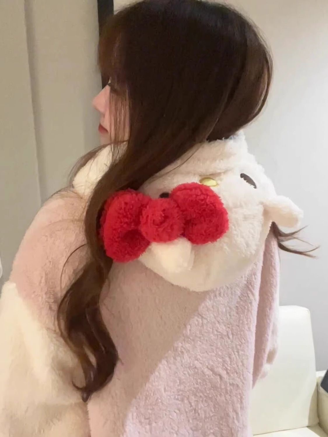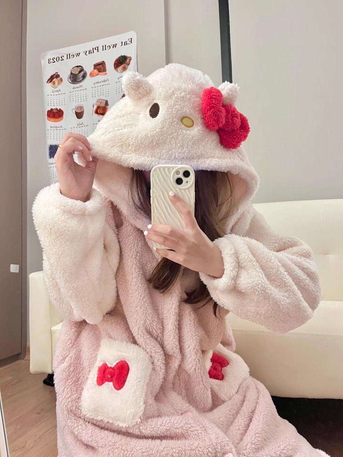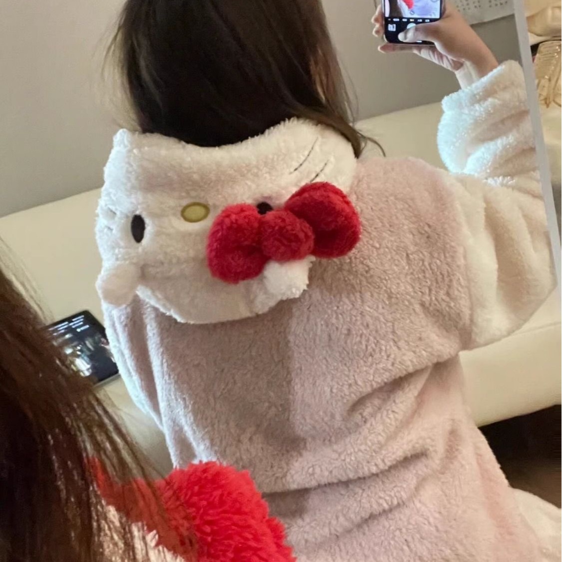 可爱卡通美乐蒂连帽珊瑚绒睡袍女冬季加绒加厚斗篷睡衣家居服套装